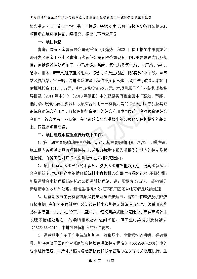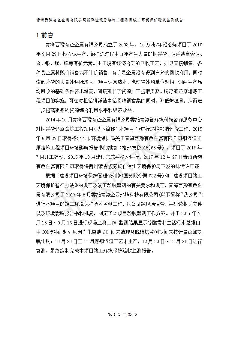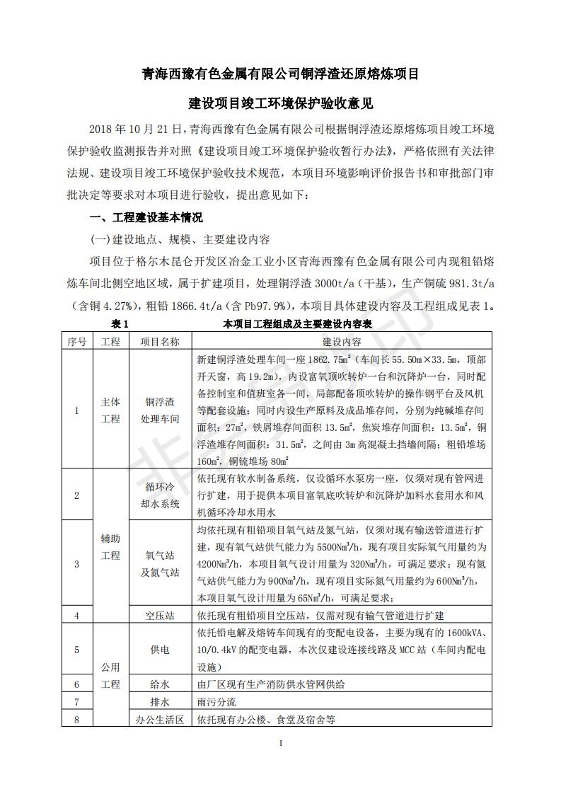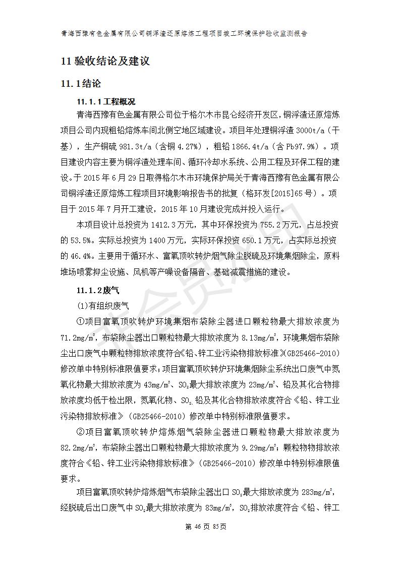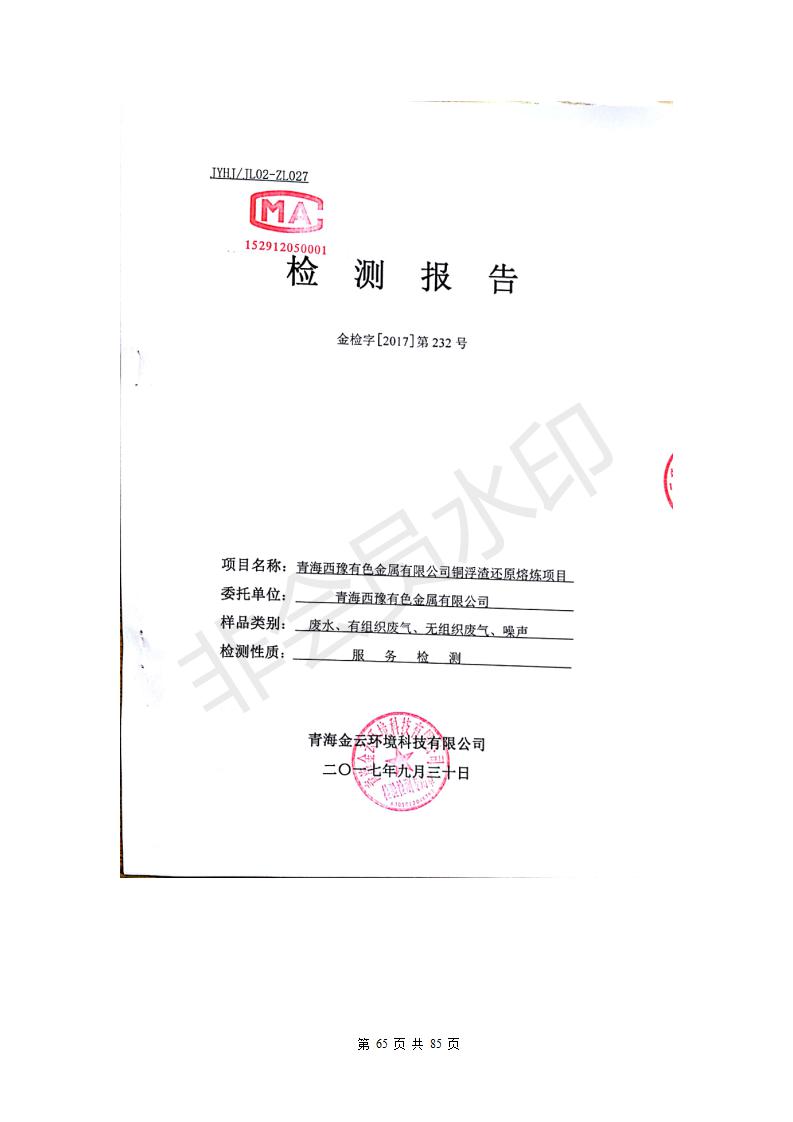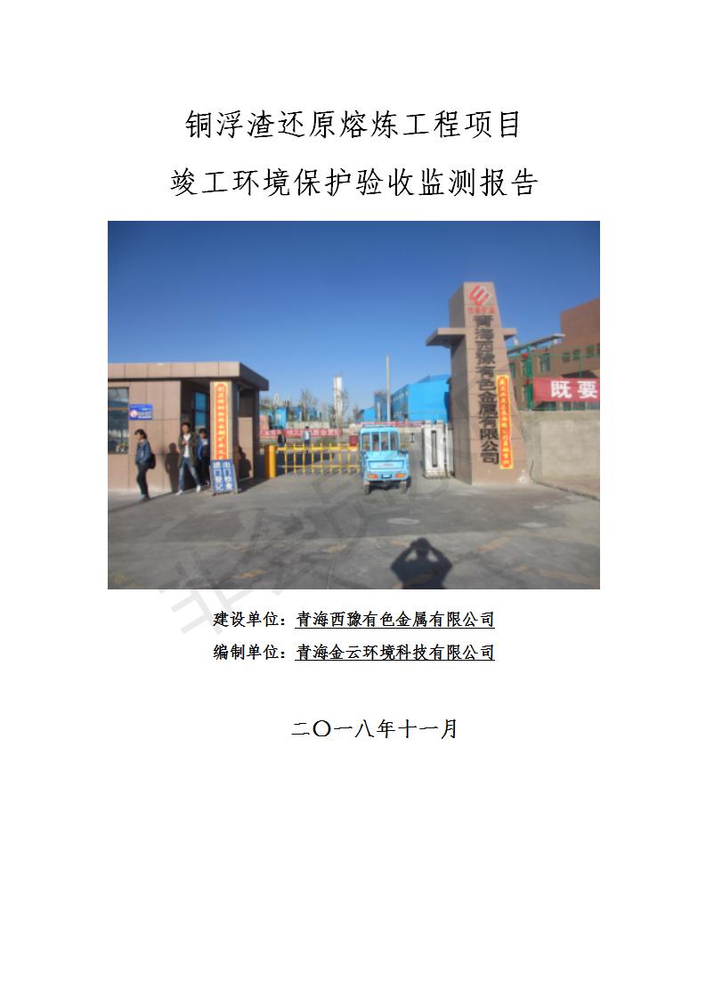 青海西豫有色金屬有限公司銅浮渣還原熔煉工程項目竣工環(huán)境保護驗收監(jiān)測報告公示發(fā)布日期:(2018-11-23) 點擊次數(shù):2508 |