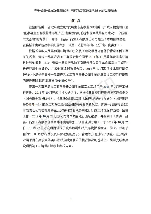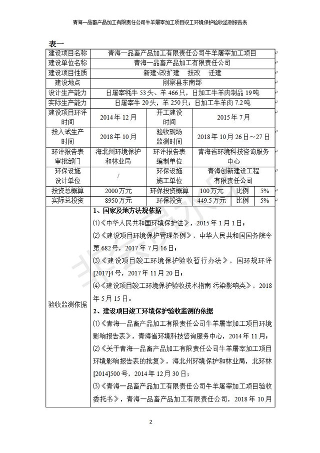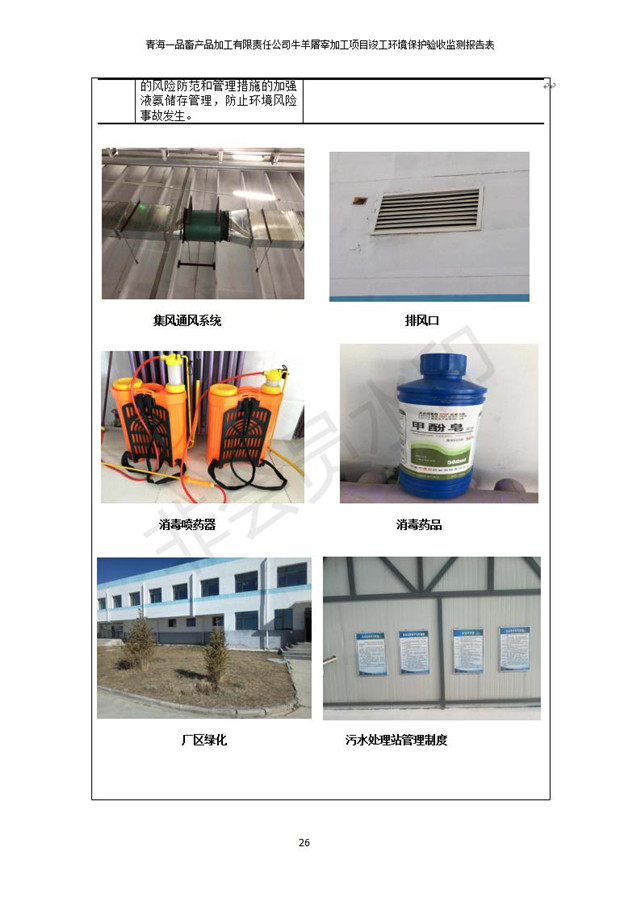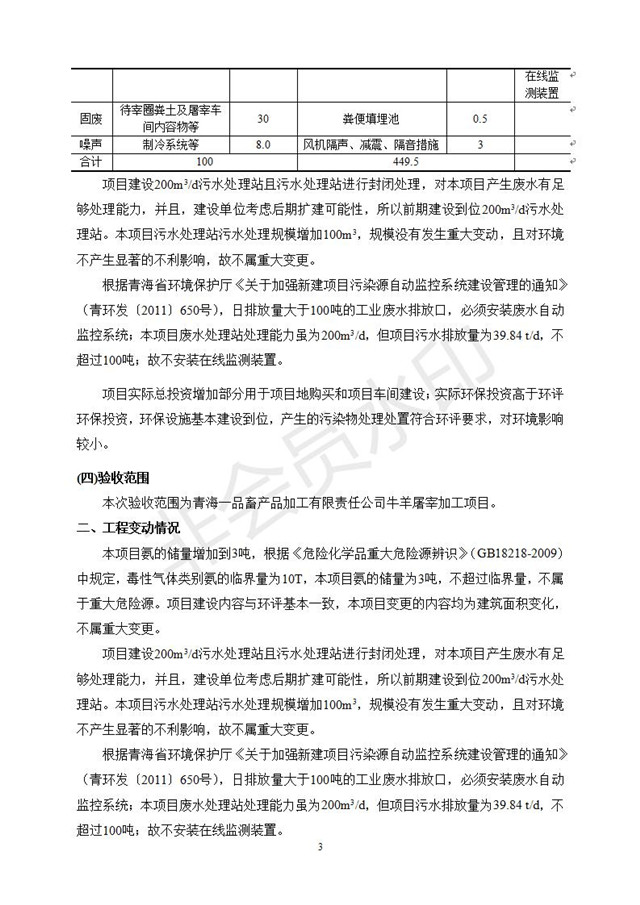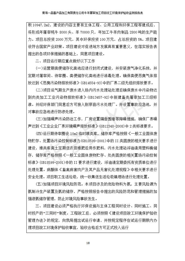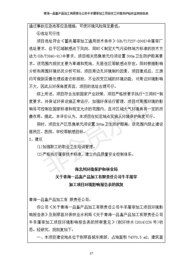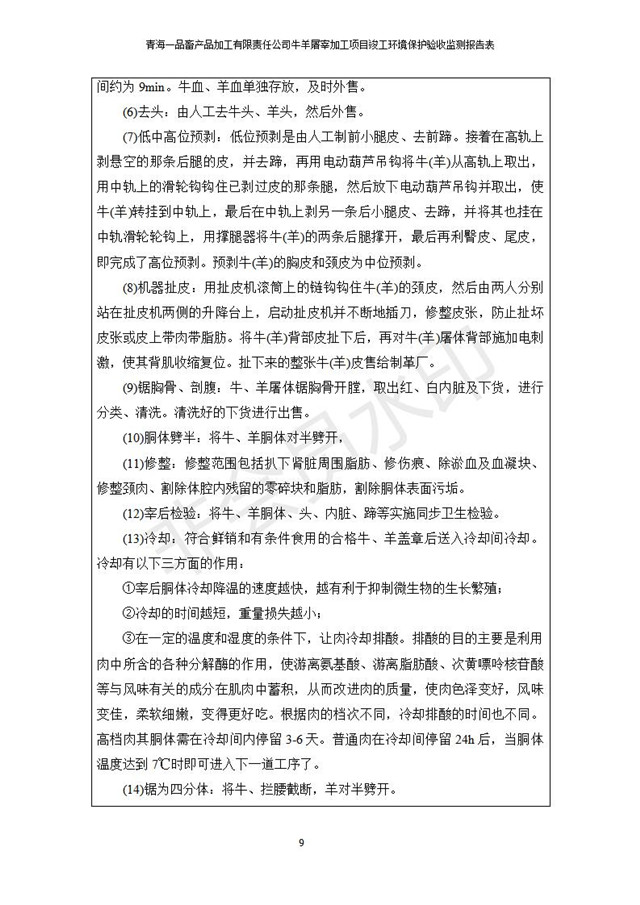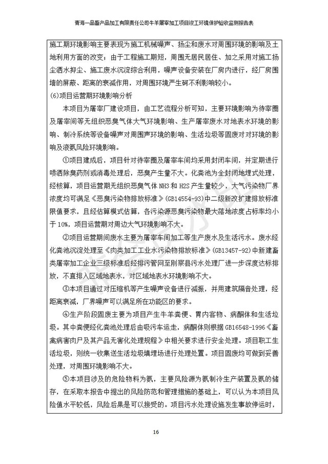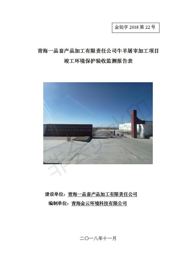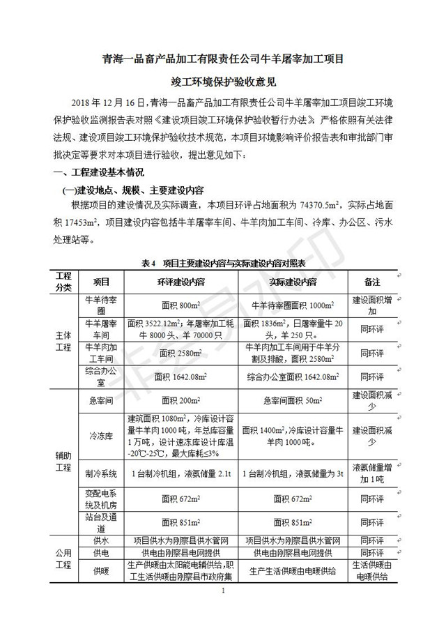 根據(jù)中華人民共和國國務(wù)院令第682號《國務(wù)院關(guān)于修改〈建設(shè)項目環(huán)境保護管理條例〉的決定》和《建設(shè)項目竣工環(huán)境保護驗收暫行辦法》(國務(wù)院令682號),青海一品畜產(chǎn)品加工有限責任公司牛羊屠宰加工項目(包括竣工環(huán)境保護驗收監(jiān)測報告表和驗收意見)公示如下。 一、項目名稱:青海一品畜產(chǎn)品加工有限責任公司牛羊屠宰加工項目竣工環(huán)境保護驗收監(jiān)測報告表 二、地點:剛察縣縣城東大街加油站東側(cè) 三、建設(shè)單位:青海一品畜產(chǎn)品加工有限責任公司 四、建設(shè)內(nèi)容:項目地面積17453m2,項目建設(shè)內(nèi)容包括牛羊屠宰車間、牛羊肉加工車間、冷庫、辦公區(qū)、污水處理站等。 五、聯(lián)系人:張工 七、公示時間:二〇一九年一月十一日至二〇一九年二月七日 公示期間,對上述公示內(nèi)容如有異議,請以書面形式反饋,個人須署真實姓名,單位須加蓋公章。