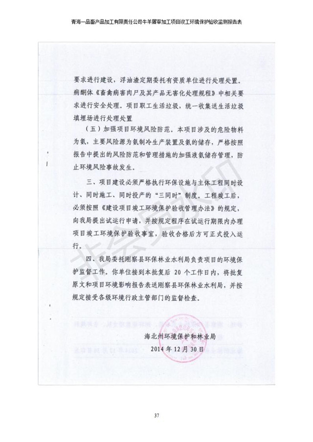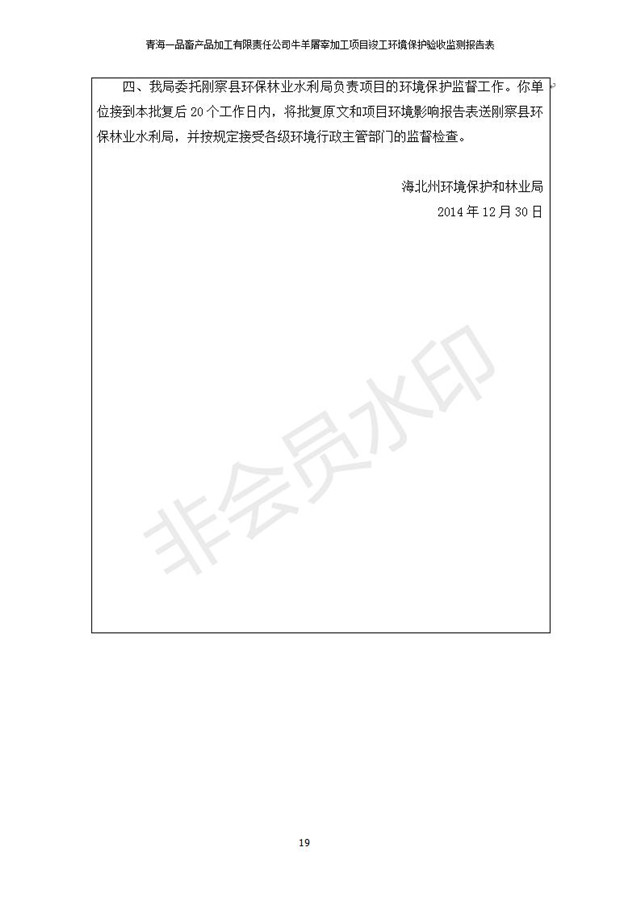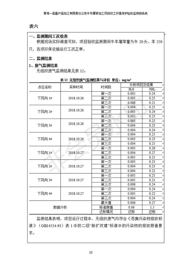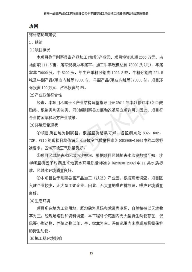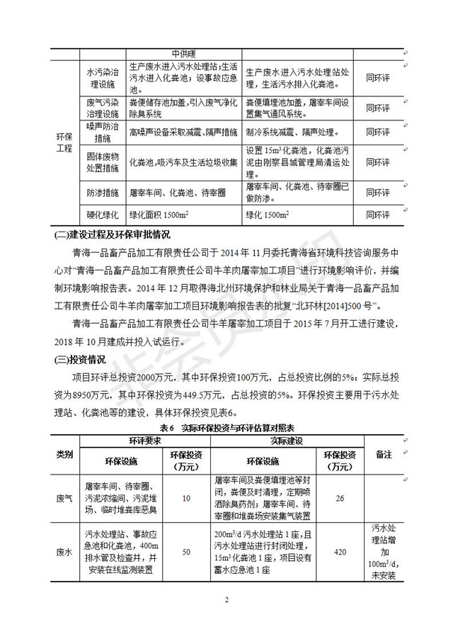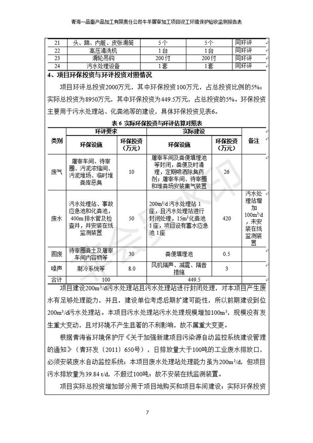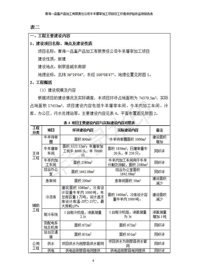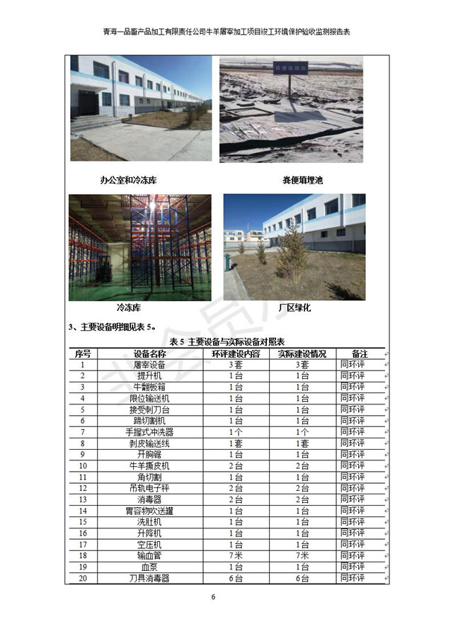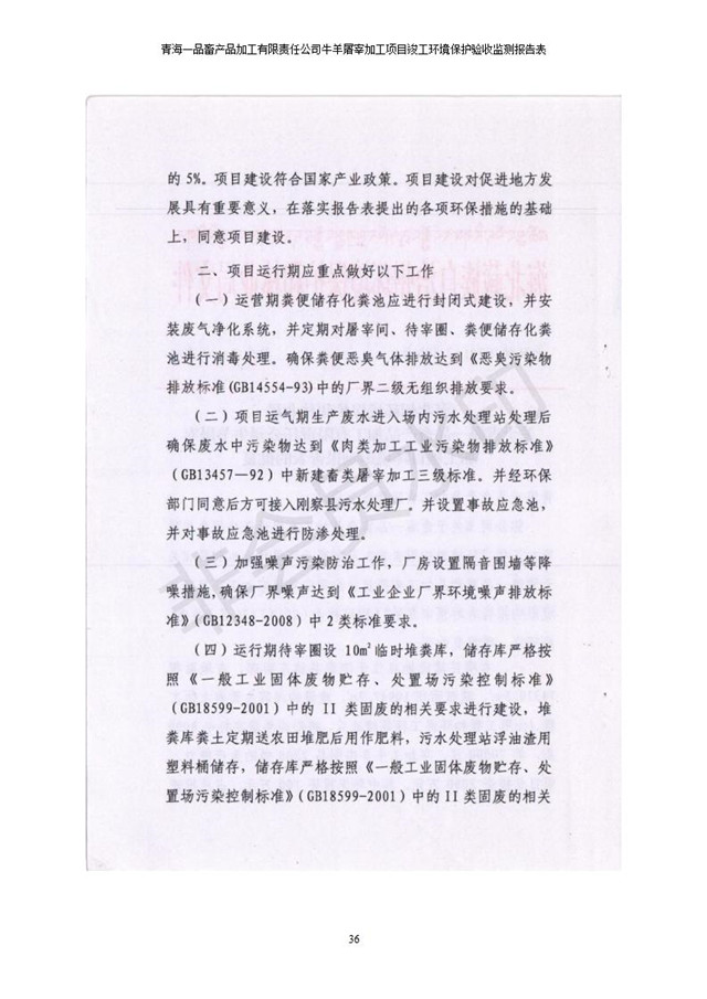 根據(jù)中華人民共和國國務(wù)院令第682號《國務(wù)院關(guān)于修改〈建設(shè)項目環(huán)境保護管理條例〉的決定》和《建設(shè)項目竣工環(huán)境保護驗收暫行辦法》(國務(wù)院令682號),青海一品畜產(chǎn)品加工有限責任公司牛羊屠宰加工項目(包括竣工環(huán)境保護驗收監(jiān)測報告表和驗收意見)公示如下。 一、項目名稱:青海一品畜產(chǎn)品加工有限責任公司牛羊屠宰加工項目竣工環(huán)境保護驗收監(jiān)測報告表 二、地點:剛察縣縣城東大街加油站東側(cè) 三、建設(shè)單位:青海一品畜產(chǎn)品加工有限責任公司 四、建設(shè)內(nèi)容:項目地面積17453m2,項目建設(shè)內(nèi)容包括牛羊屠宰車間、牛羊肉加工車間、冷庫、辦公區(qū)、污水處理站等。 五、聯(lián)系人:張工 七、公示時間:二〇一九年一月十一日至二〇一九年二月七日 公示期間,對上述公示內(nèi)容如有異議,請以書面形式反饋,個人須署真實姓名,單位須加蓋公章。
