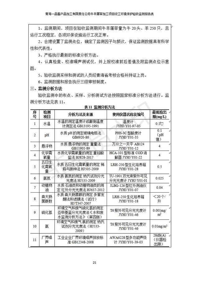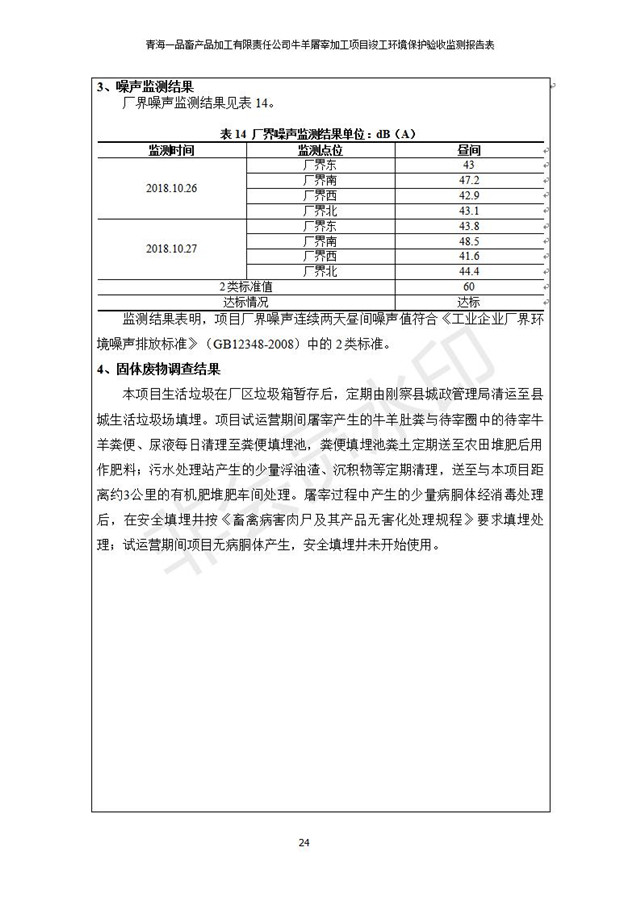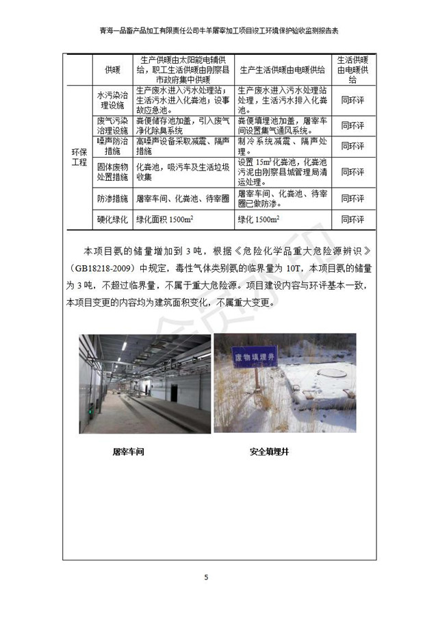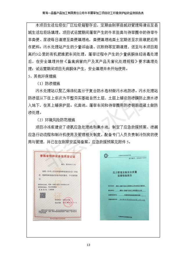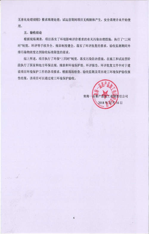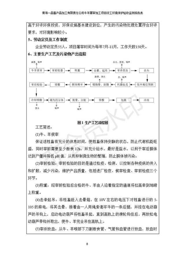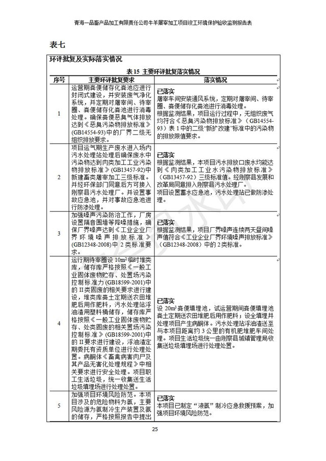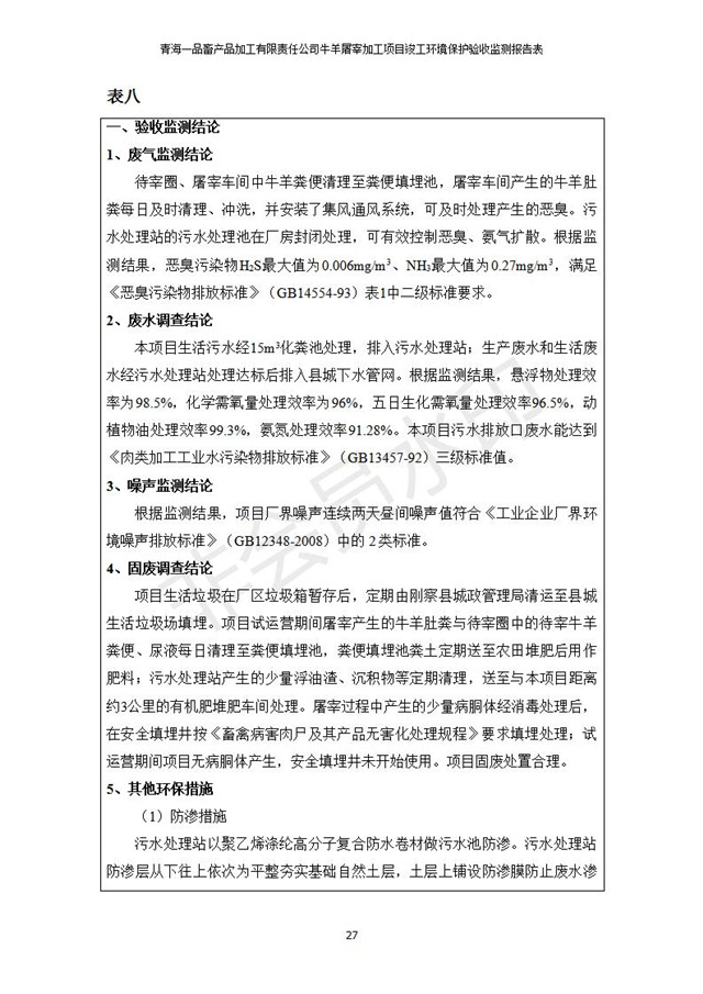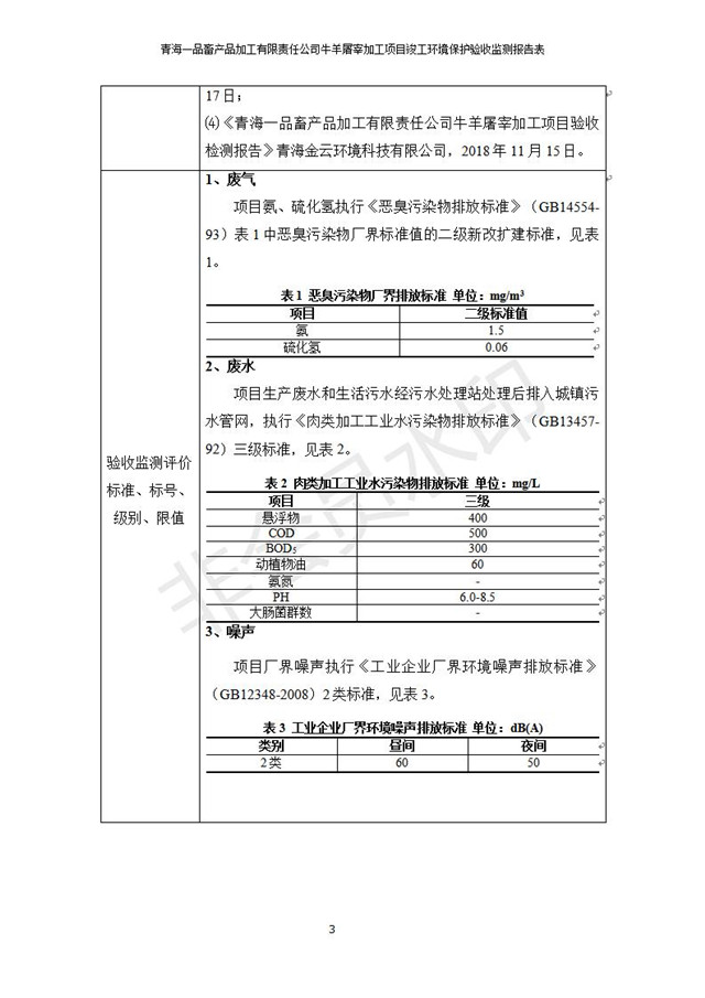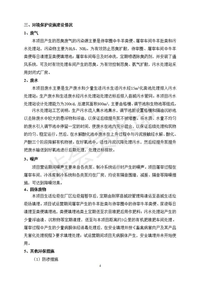 根據(jù)中華人民共和國國務(wù)院令第682號《國務(wù)院關(guān)于修改〈建設(shè)項目環(huán)境保護管理條例〉的決定》和《建設(shè)項目竣工環(huán)境保護驗收暫行辦法》(國務(wù)院令682號),青海一品畜產(chǎn)品加工有限責任公司牛羊屠宰加工項目(包括竣工環(huán)境保護驗收監(jiān)測報告表和驗收意見)公示如下。 一、項目名稱:青海一品畜產(chǎn)品加工有限責任公司牛羊屠宰加工項目竣工環(huán)境保護驗收監(jiān)測報告表 二、地點:剛察縣縣城東大街加油站東側(cè) 三、建設(shè)單位:青海一品畜產(chǎn)品加工有限責任公司 四、建設(shè)內(nèi)容:項目地面積17453m2,項目建設(shè)內(nèi)容包括牛羊屠宰車間、牛羊肉加工車間、冷庫、辦公區(qū)、污水處理站等。 五、聯(lián)系人:張工 七、公示時間:二〇一九年一月十一日至二〇一九年二月七日 公示期間,對上述公示內(nèi)容如有異議,請以書面形式反饋,個人須署真實姓名,單位須加蓋公章。