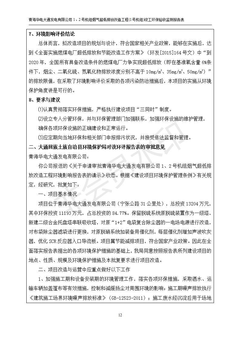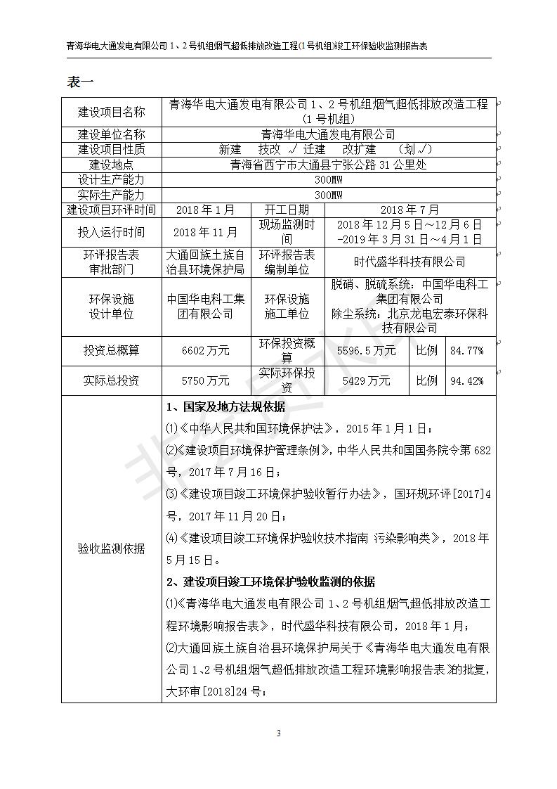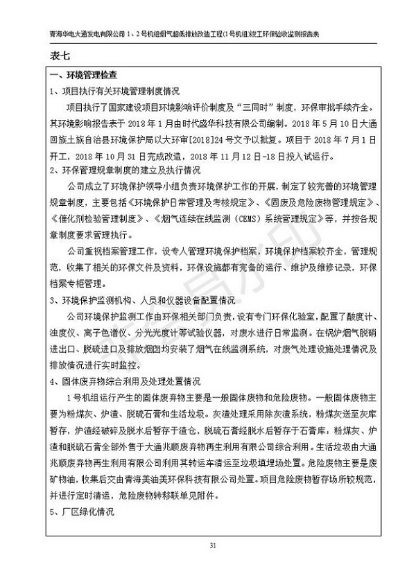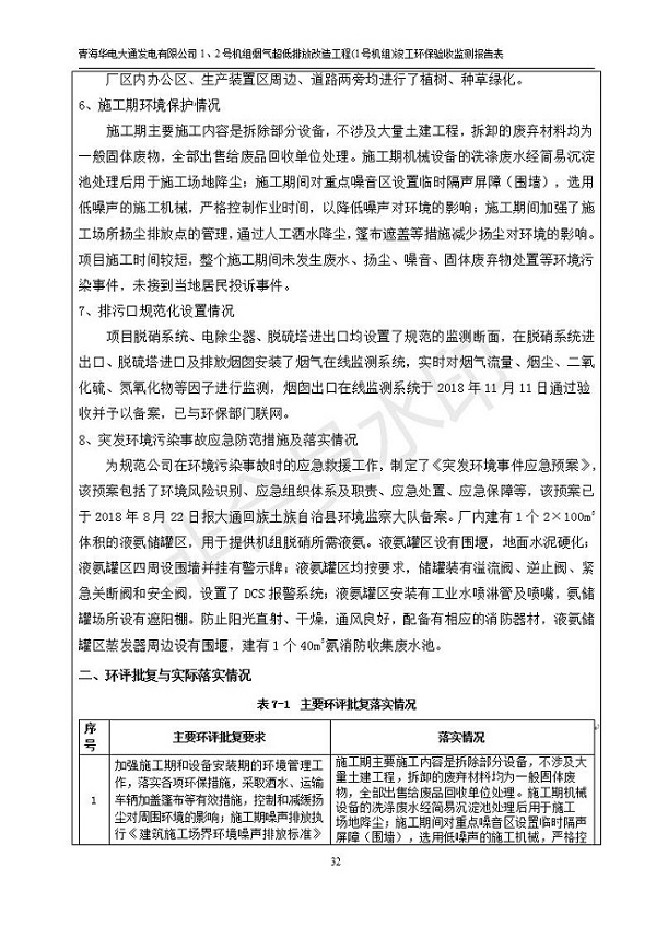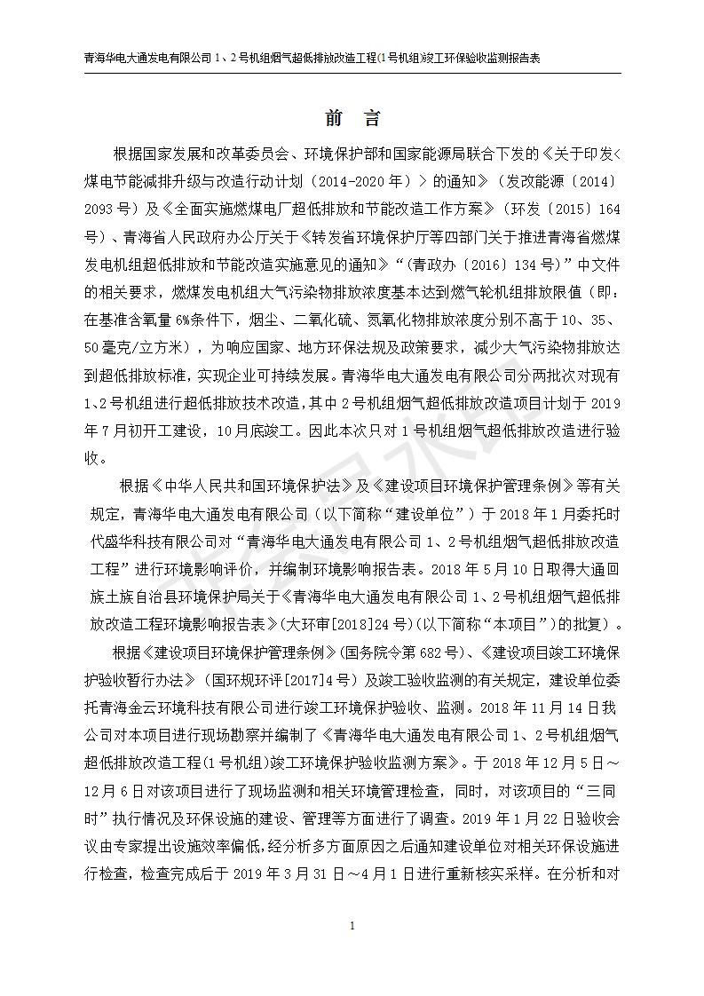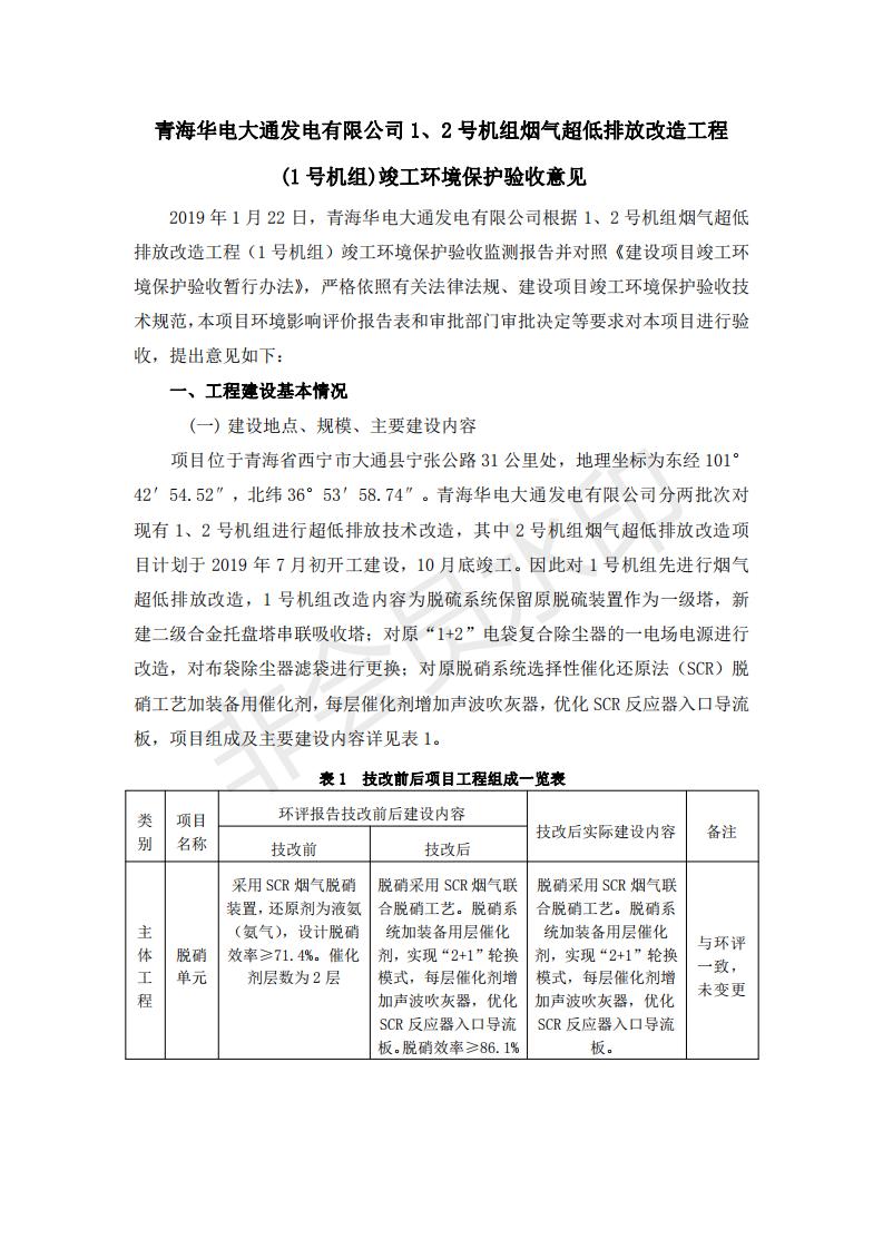 根據(jù)中華人民共和國國務(wù)院令第682號《國務(wù)院關(guān)于修改〈建設(shè)項目環(huán)境保護(hù)管理條例〉的決定》和《建設(shè)項目竣工環(huán)境保護(hù)驗收暫行辦法》(國務(wù)院令682號),青海華電大通發(fā)電有限公司1、2號機(jī)組煙氣超低排放改造工程(1號機(jī)組) (包括竣工環(huán)境保護(hù)驗收監(jiān)測報告表和驗收意見)公示如下。 一、項目名稱:青海華電大通發(fā)電有限公司1、2號機(jī)組煙氣超低排放改造工程(1號機(jī)組) 竣工環(huán)境保護(hù)驗收監(jiān)測報告表 二、地點:青海省西寧市大通縣寧張公路31公里處 三、建設(shè)單位:青海華電大通發(fā)電有限公司 四、建設(shè)內(nèi)容:1號機(jī)組煙氣超低排放改造,1號機(jī)組改造內(nèi)容為脫硫系統(tǒng)保留原脫硫裝置作為一級塔,新建二級合金托盤塔串聯(lián)吸收塔;對原“1+2”電袋復(fù)合除塵器的一電場電源進(jìn)行改造,對布袋除塵器濾袋進(jìn)行更換;對原脫硝系統(tǒng)選擇性催化還原法(SCR)脫硝工藝加裝備用催化劑,每層催化劑增加聲波吹灰器,優(yōu)化SCR反應(yīng)器入口導(dǎo)流板。 五、聯(lián)系人:張工 六、聯(lián)系電 話:0971-6515411 七、公示時間:二〇一九年二月十三日至二〇一九年三月十二日 公示期間,對上述公示內(nèi)容如有異議,請以書面形式反饋,個人須署真實姓名,單位須加蓋公章。