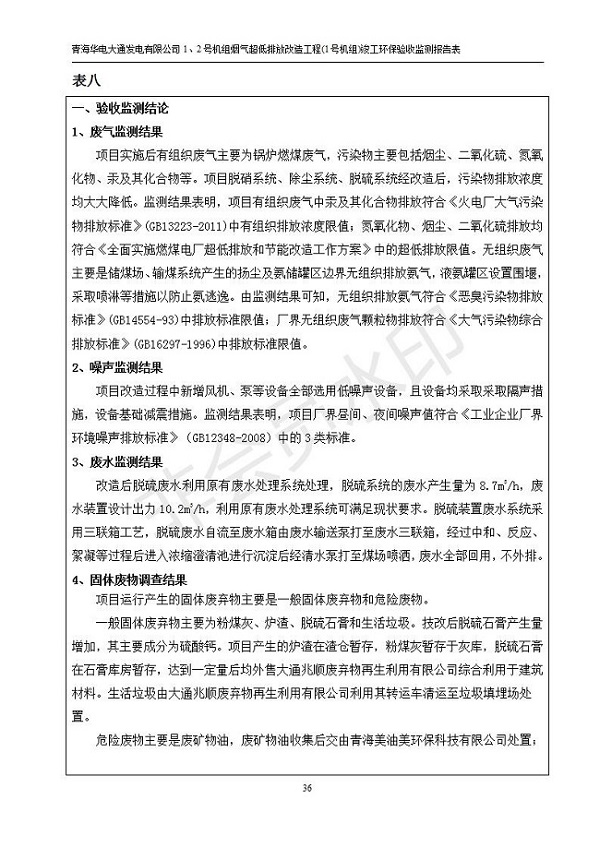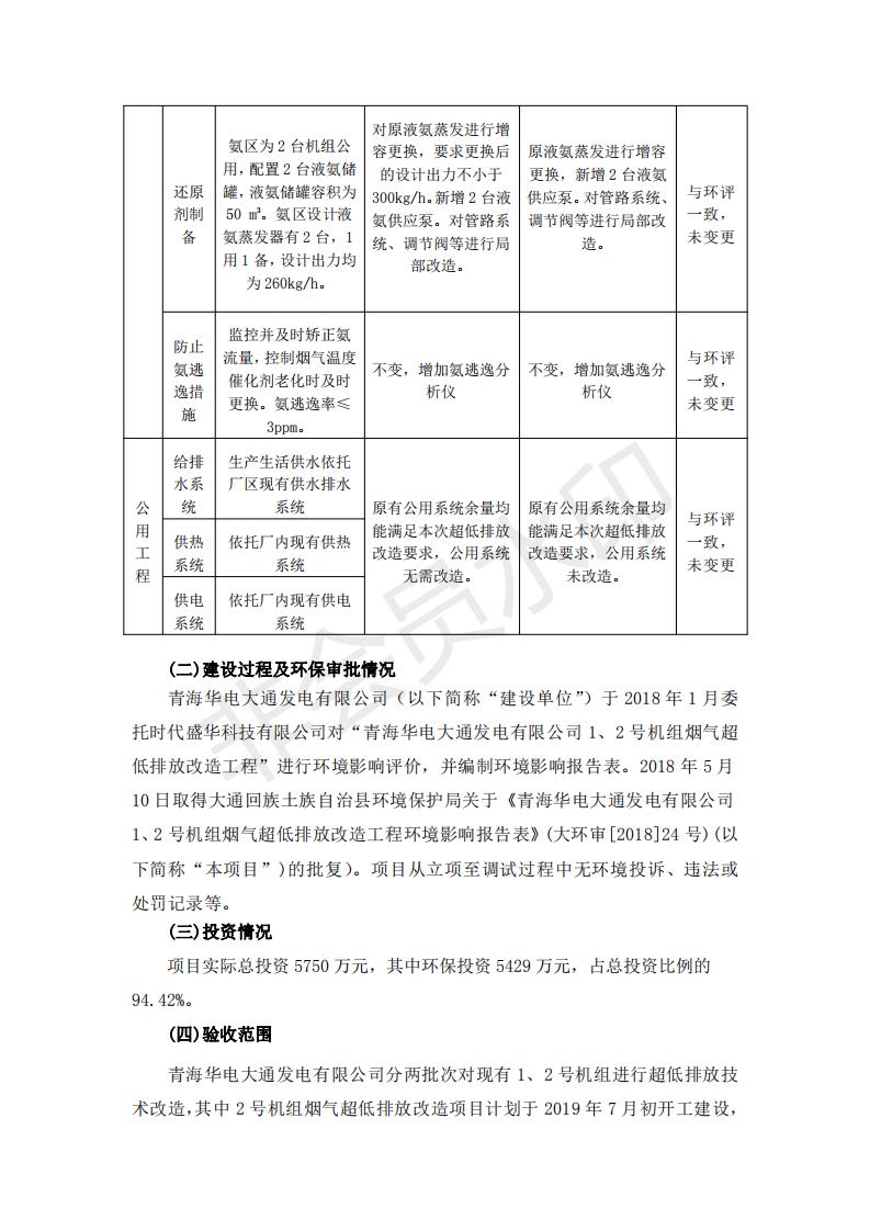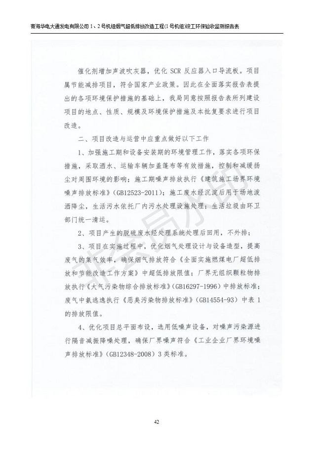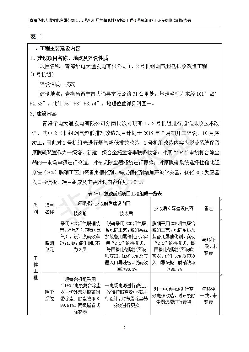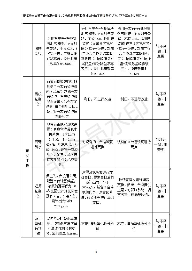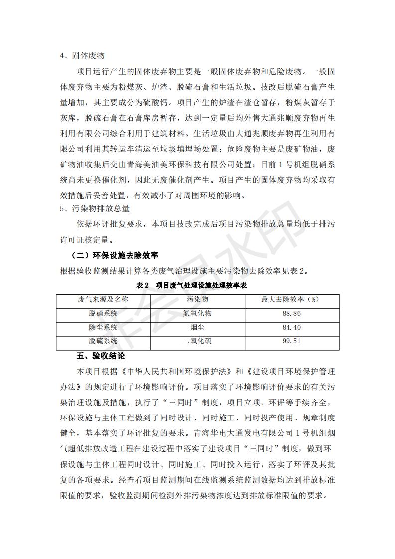 根據(jù)中華人民共和國國務(wù)院令第682號《國務(wù)院關(guān)于修改〈建設(shè)項目環(huán)境保護(hù)管理條例〉的決定》和《建設(shè)項目竣工環(huán)境保護(hù)驗收暫行辦法》(國務(wù)院令682號),青海華電大通發(fā)電有限公司1、2號機(jī)組煙氣超低排放改造工程(1號機(jī)組) (包括竣工環(huán)境保護(hù)驗收監(jiān)測報告表和驗收意見)公示如下。 一、項目名稱:青海華電大通發(fā)電有限公司1、2號機(jī)組煙氣超低排放改造工程(1號機(jī)組) 竣工環(huán)境保護(hù)驗收監(jiān)測報告表 二、地點:青海省西寧市大通縣寧張公路31公里處 三、建設(shè)單位:青海華電大通發(fā)電有限公司 四、建設(shè)內(nèi)容:1號機(jī)組煙氣超低排放改造,1號機(jī)組改造內(nèi)容為脫硫系統(tǒng)保留原脫硫裝置作為一級塔,新建二級合金托盤塔串聯(lián)吸收塔;對原“1+2”電袋復(fù)合除塵器的一電場電源進(jìn)行改造,對布袋除塵器濾袋進(jìn)行更換;對原脫硝系統(tǒng)選擇性催化還原法(SCR)脫硝工藝加裝備用催化劑,每層催化劑增加聲波吹灰器,優(yōu)化SCR反應(yīng)器入口導(dǎo)流板。 五、聯(lián)系人:張工 六、聯(lián)系電 話:0971-6515411 七、公示時間:二〇一九年二月十三日至二〇一九年三月十二日 公示期間,對上述公示內(nèi)容如有異議,請以書面形式反饋,個人須署真實姓名,單位須加蓋公章。