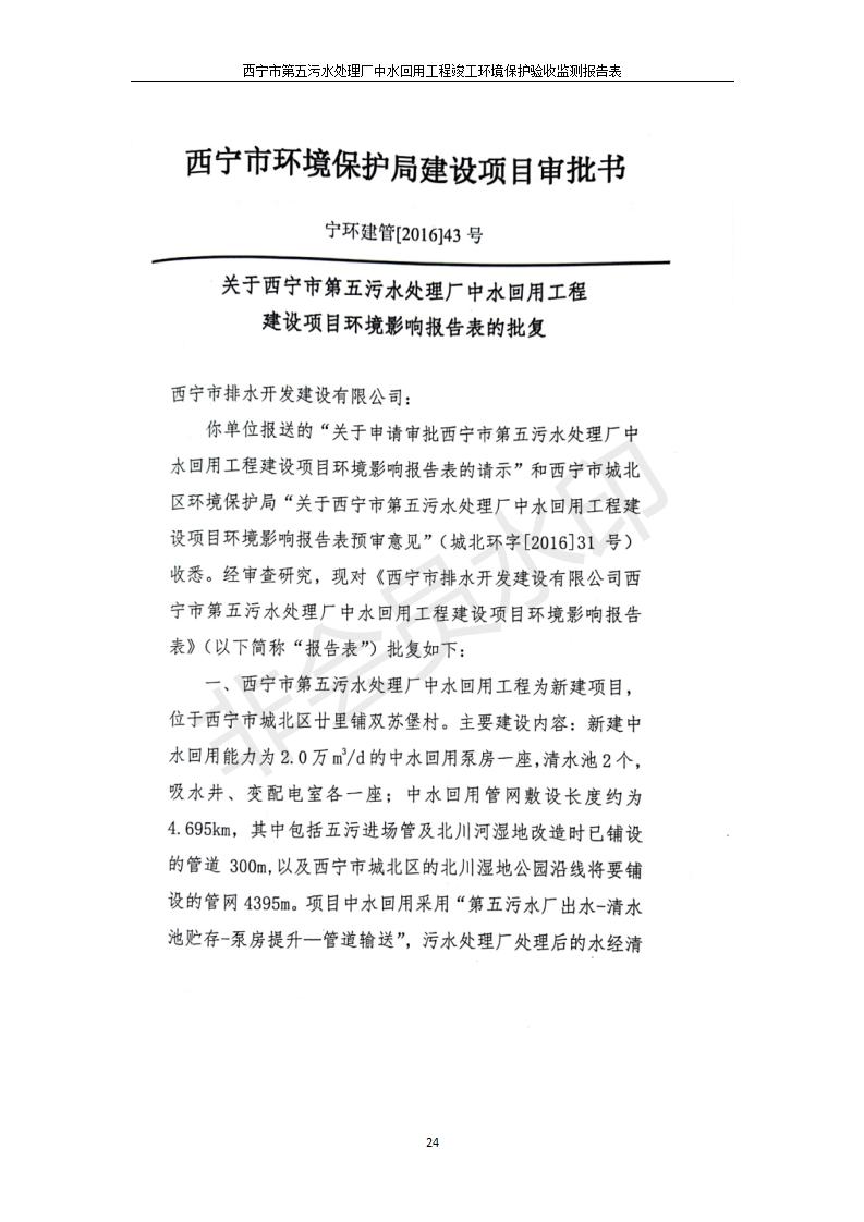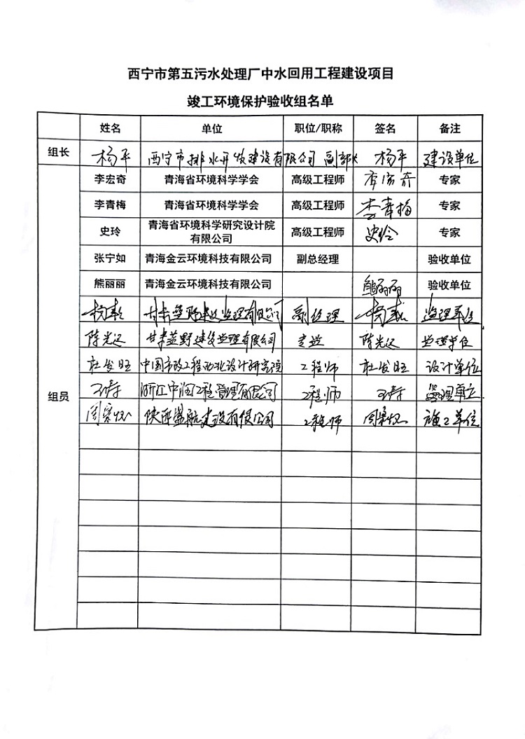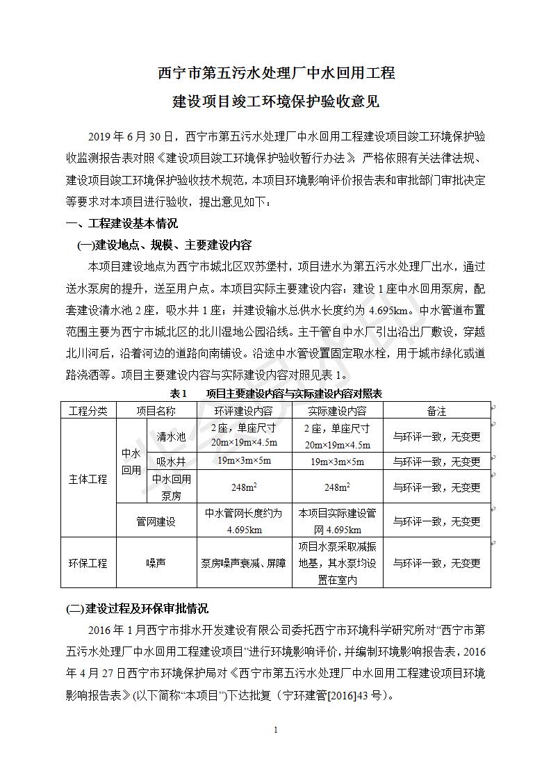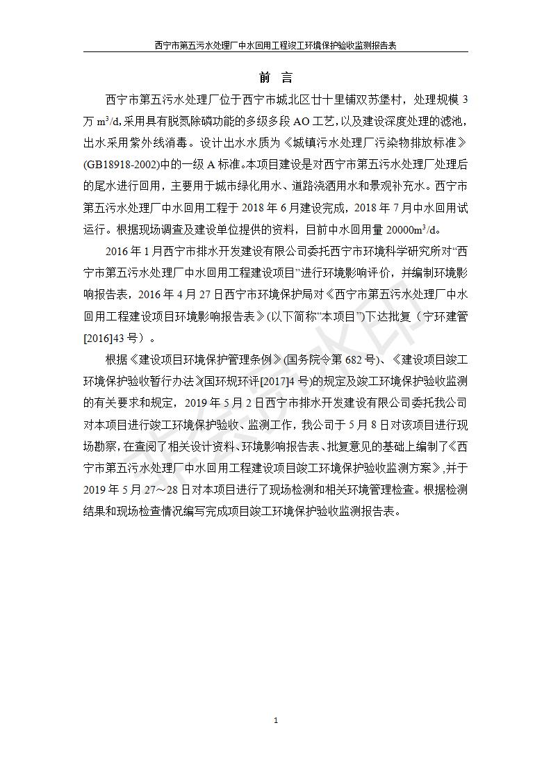根據(jù)中華人民共和國國務(wù)院令第682號《國務(wù)院關(guān)于修改〈建設(shè)項目環(huán)境保護管理條例〉的決定》和《建設(shè)項目竣工環(huán)境保護驗收暫行辦法》(國務(wù)院令682號),西寧市第五污水處理廠中水回用工程建設(shè)項目(包括竣工環(huán)境保護驗收監(jiān)測報告表和驗收意見)公示如下。 一、項目名稱:西寧市第五污水處理廠中水回用工程建設(shè)項目 二、地點:西寧市城北區(qū)廿十里鋪雙蘇堡 三、建設(shè)單位:西寧市排水開發(fā)建設(shè)有限公司