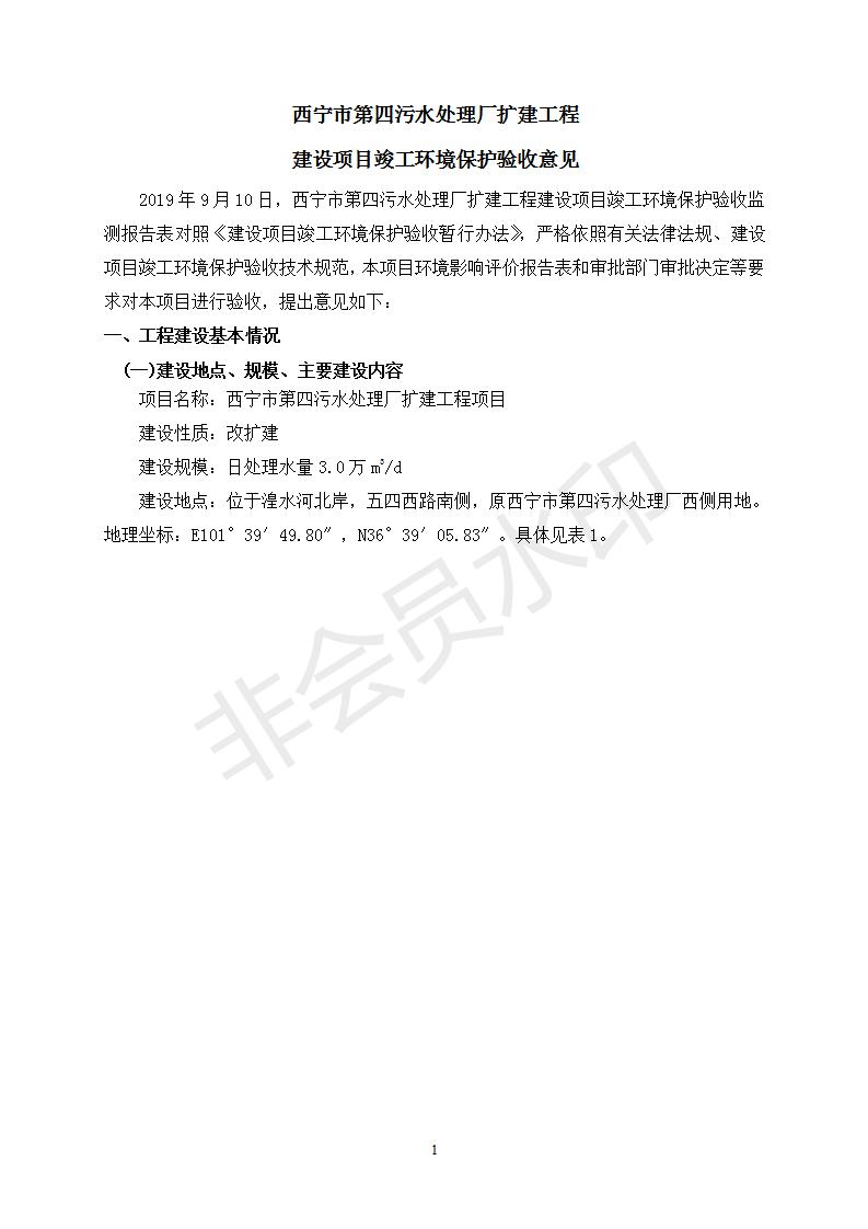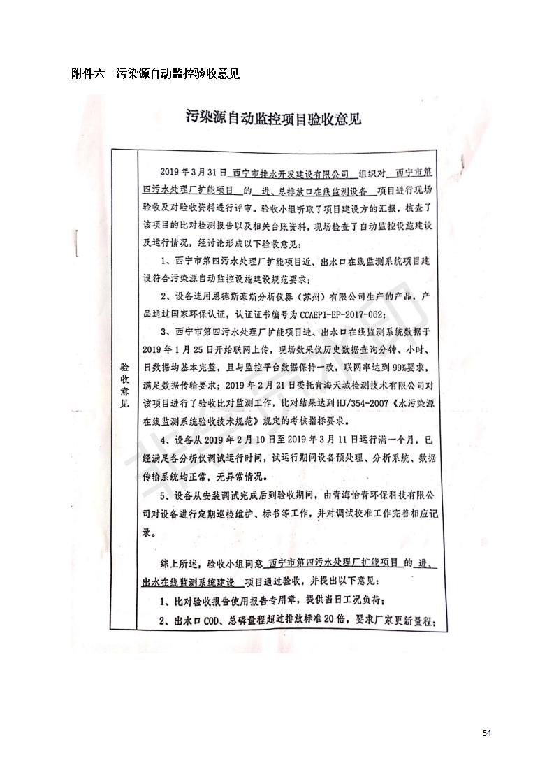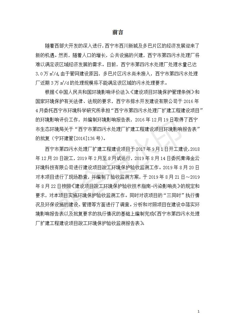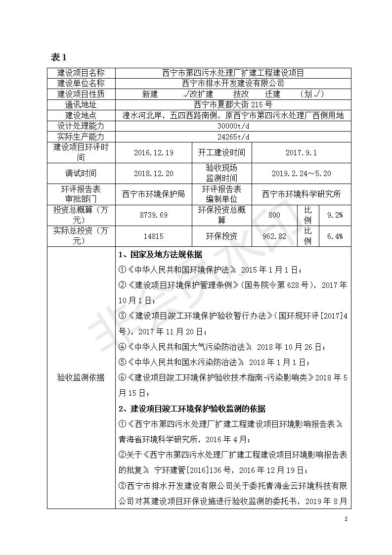 根據(jù)中華人民共和國(guó)國(guó)務(wù)院令第682號(hào)《國(guó)務(wù)院關(guān)于修改〈建設(shè)項(xiàng)目環(huán)境保護(hù)管理?xiàng)l例〉的決定》和《建設(shè)項(xiàng)目竣工環(huán)境保護(hù)驗(yàn)收暫行辦法》(國(guó)務(wù)院令682號(hào)),西寧市第四污水處理廠擴(kuò)建工程建設(shè)項(xiàng)目(包括竣工環(huán)境保護(hù)驗(yàn)收監(jiān)測(cè)報(bào)告表和驗(yàn)收意見)公示如下。 一、項(xiàng)目名稱:西寧市第四污水處理廠擴(kuò)建工程建設(shè)項(xiàng)目 二、地點(diǎn):五四西路南側(cè),原西寧市第四污水處理廠西側(cè)用地 三、建設(shè)單位:西寧市排水開發(fā)建設(shè)有限公司 四、建設(shè)內(nèi)容:第四污水處理廠擴(kuò)建工程五、聯(lián)系人:張工 六、聯(lián)系電 話:0971-6515411 七、公示時(shí)間:二〇一九年九月十七日至二〇一九年十月十八日公示期間,對(duì)上述公示內(nèi)容如有異議,請(qǐng)以書面形式反饋,個(gè)人須署真實(shí)姓名,單位須加蓋公章。