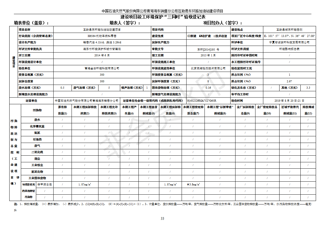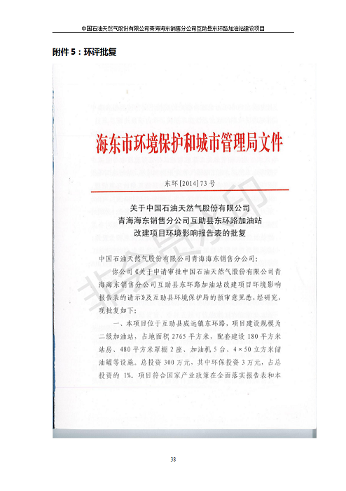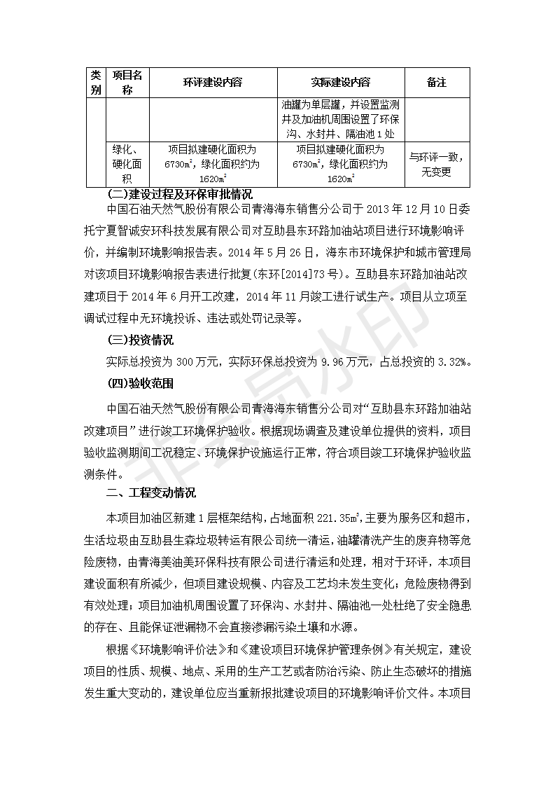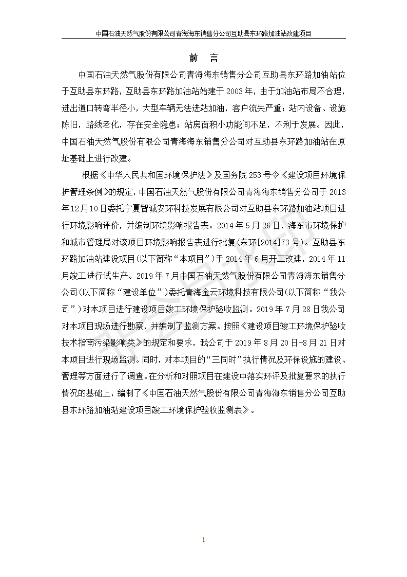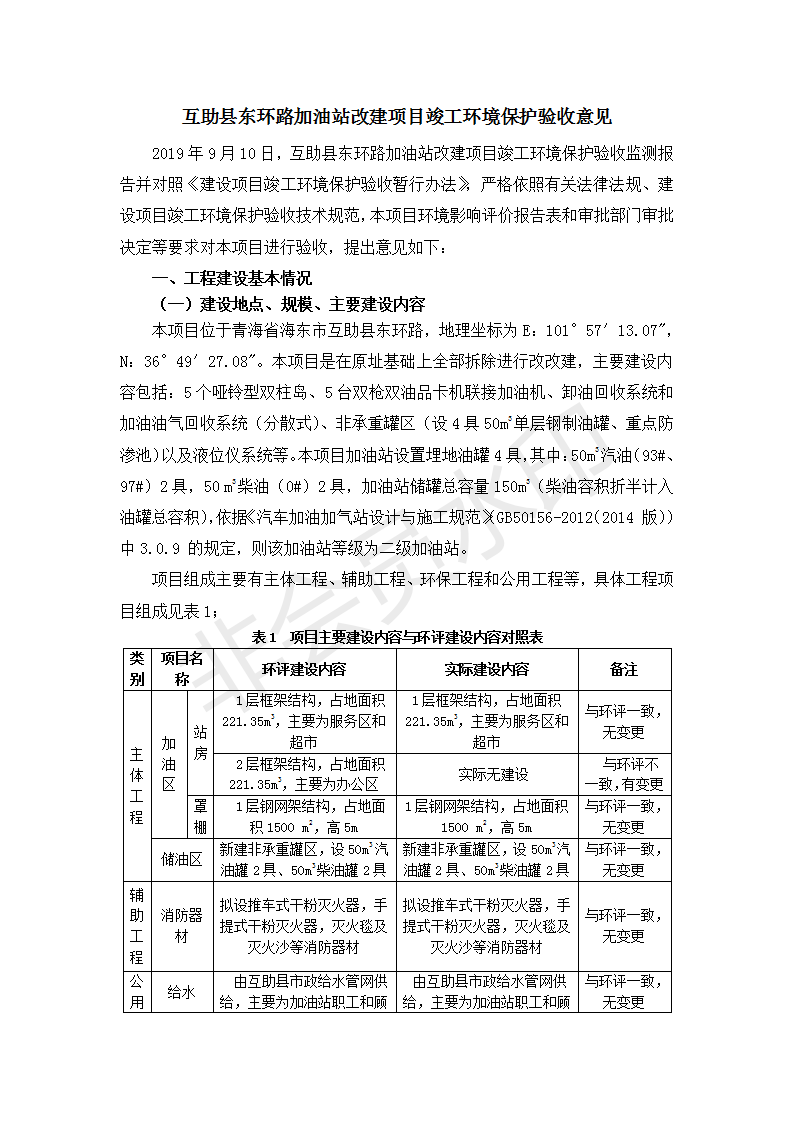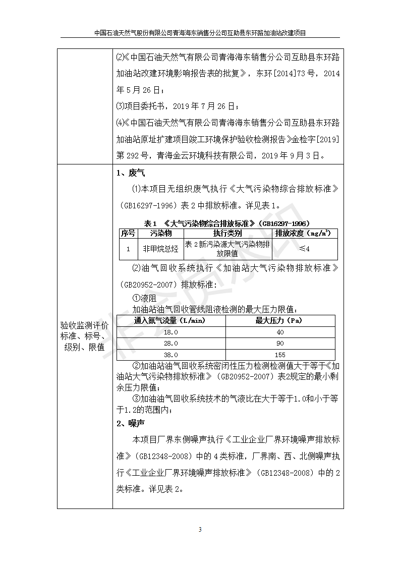 根據(jù)中華人民共和國(guó)國(guó)務(wù)院令第682號(hào)《國(guó)務(wù)院關(guān)于修改〈建設(shè)項(xiàng)目環(huán)境保護(hù)管理?xiàng)l例〉的決定》和《建設(shè)項(xiàng)目竣工環(huán)境保護(hù)驗(yàn)收暫行辦法》(國(guó)務(wù)院令682號(hào)),互助縣東環(huán)路加油站改建項(xiàng)目(包括竣工環(huán)境保護(hù)驗(yàn)收監(jiān)測(cè)報(bào)告表和驗(yàn)收意見)公示如下。 一、項(xiàng)目名稱:互助縣東環(huán)路加油站改建項(xiàng)目 二、地點(diǎn):青海省海東市互助縣東環(huán)路 六、聯(lián)系電話:0971-6515411 七、公示時(shí)間:二〇一九年九月二十七日至二〇一九年十月二十九日 公示期間,對(duì)上述公示內(nèi)容如有異議,請(qǐng)以書面形式反饋,個(gè)人須署真實(shí)姓名,單位須加蓋公章。