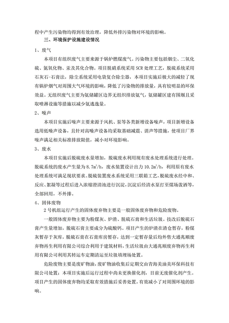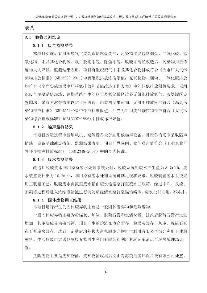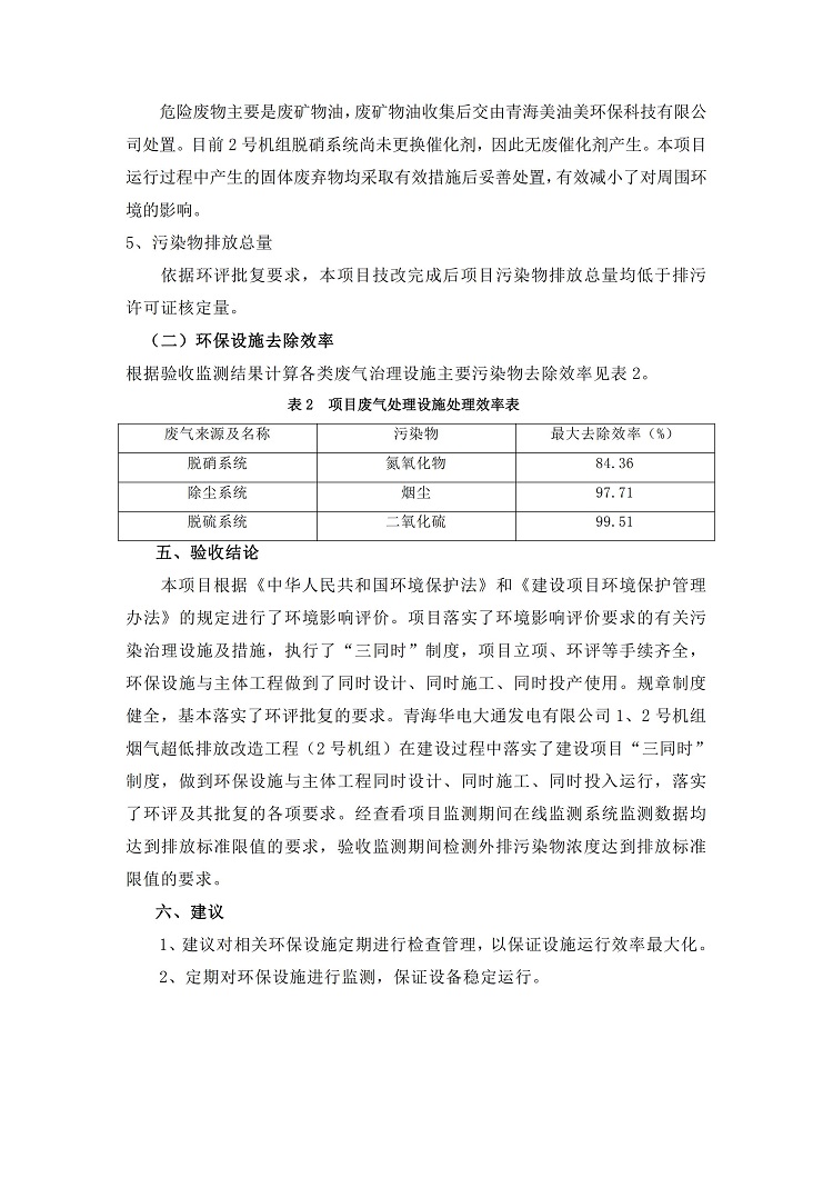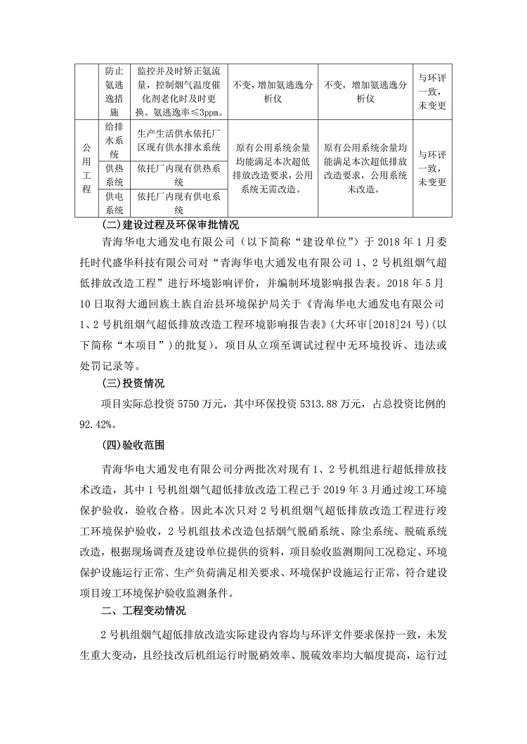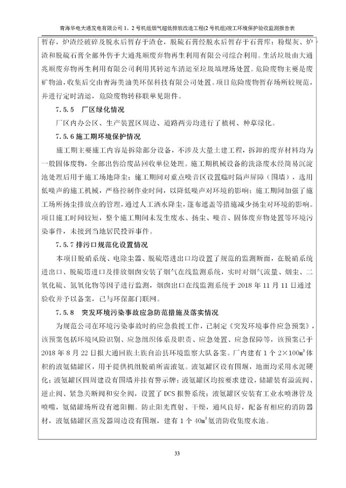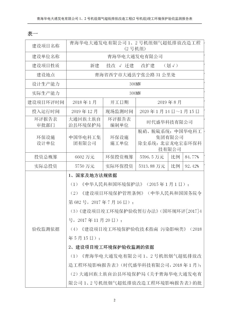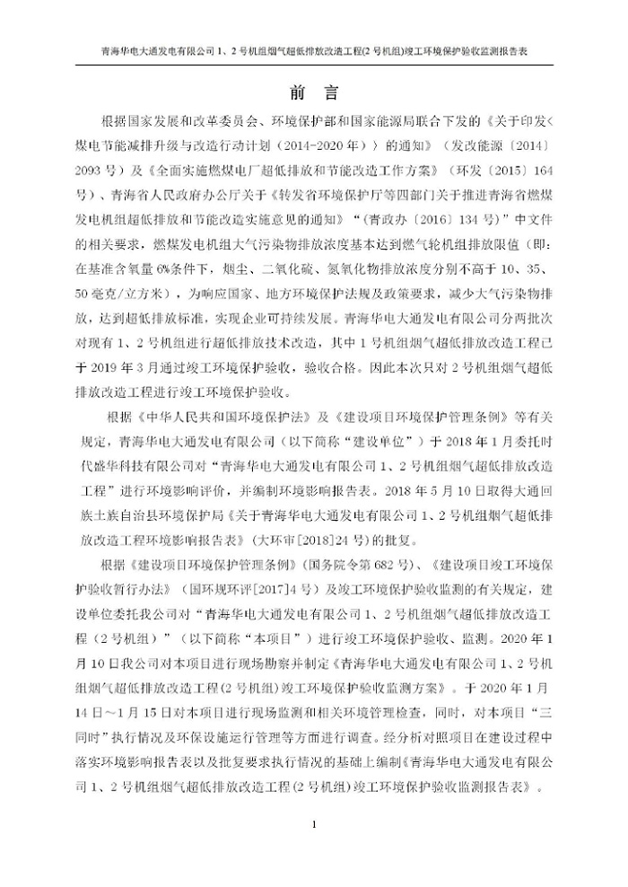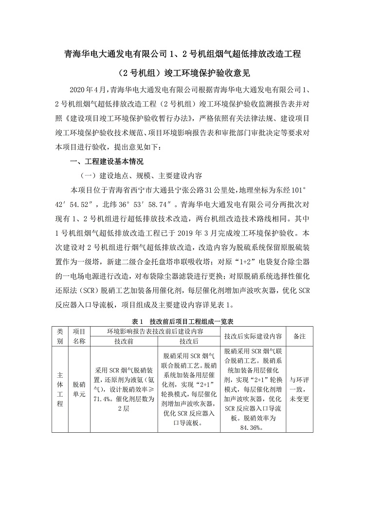 根據(jù)中華人民共和國國務(wù)院令第682號(hào)《國務(wù)院關(guān)于修改〈建設(shè)項(xiàng)目環(huán)境保護(hù)管理?xiàng)l例〉的決定》和《建設(shè)項(xiàng)目竣工環(huán)境保護(hù)驗(yàn)收暫行辦法》(國務(wù)院令682號(hào)),青海華電大通發(fā)電有限公司1、2號(hào)機(jī)組煙氣超低排放改造工程(2號(hào)機(jī)組) (包括竣工環(huán)境保護(hù)驗(yàn)收監(jiān)測報(bào)告表和驗(yàn)收意見)公示如下。 一、項(xiàng)目名稱:青海華電大通發(fā)電有限公司1、2號(hào)機(jī)組煙氣超低排放改造工程(2號(hào)機(jī)組) 竣工環(huán)境保護(hù)驗(yàn)收監(jiān)測報(bào)告表 二、地點(diǎn):青海省西寧市大通縣寧張公路31公里處 三、建設(shè)單位:青海華電大通發(fā)電有限公司 四、建設(shè)內(nèi)容:2號(hào)機(jī)組煙氣超低排放改造,2號(hào)機(jī)組改造內(nèi)容為脫硫系統(tǒng)保留原脫硫裝置作為一級(jí)塔,新建二級(jí)合金托盤塔串聯(lián)吸收塔;對(duì)原“1+2”電袋復(fù)合除塵器的一電場電源進(jìn)行改造,對(duì)布袋除塵器濾袋進(jìn)行更換;對(duì)原脫硝系統(tǒng)選擇性催化還原法(SCR)脫硝工藝加裝備用催化劑,每層催化劑增加聲波吹灰器,優(yōu)化SCR反應(yīng)器入口導(dǎo)流板。 五、聯(lián)系人:馬世敏 六、聯(lián)系電 話:0971-6515411 七、公示時(shí)間:二〇二〇年四月二十九日至二〇二〇年五月二十八日 公示期間,對(duì)上述公示內(nèi)容如有異議,請(qǐng)以書面形式反饋,個(gè)人須署真實(shí)姓名,單位須加蓋公章。