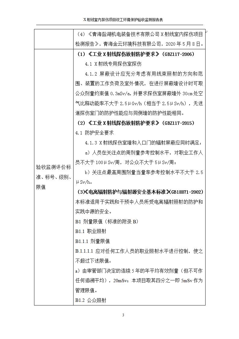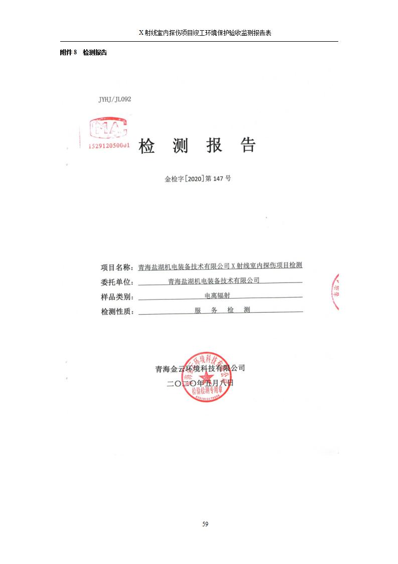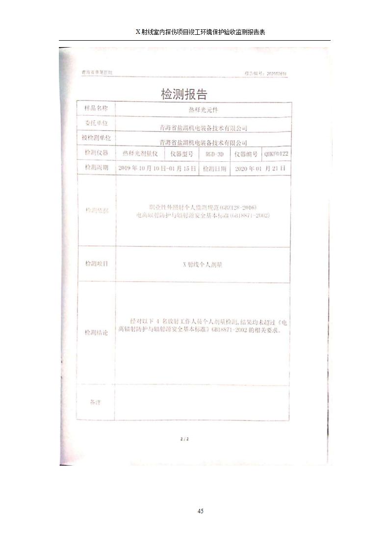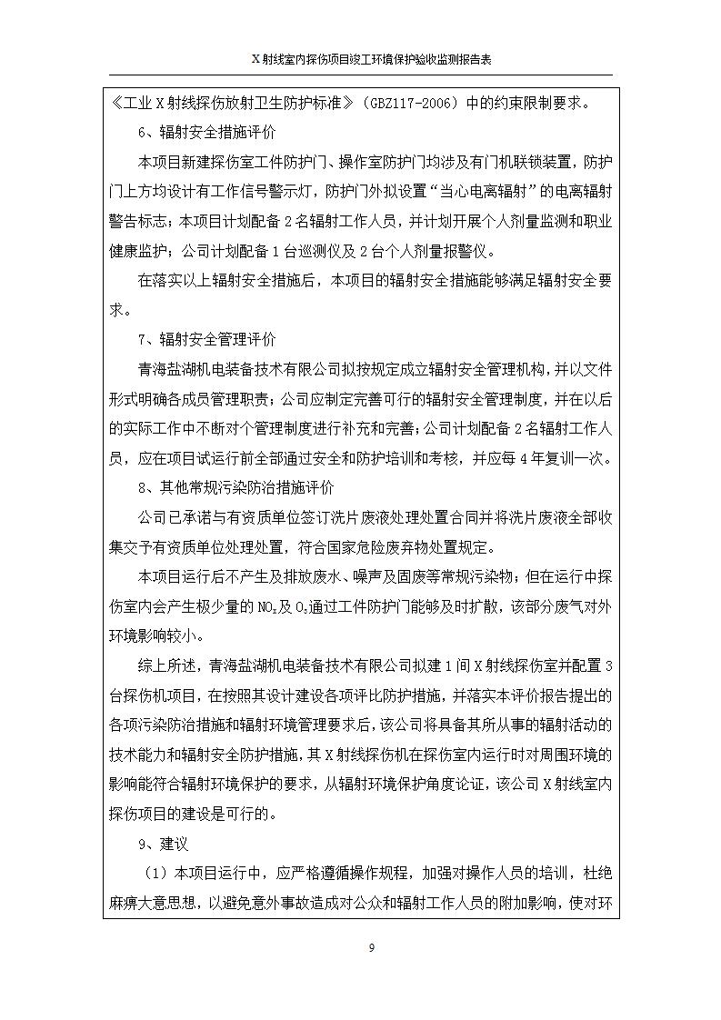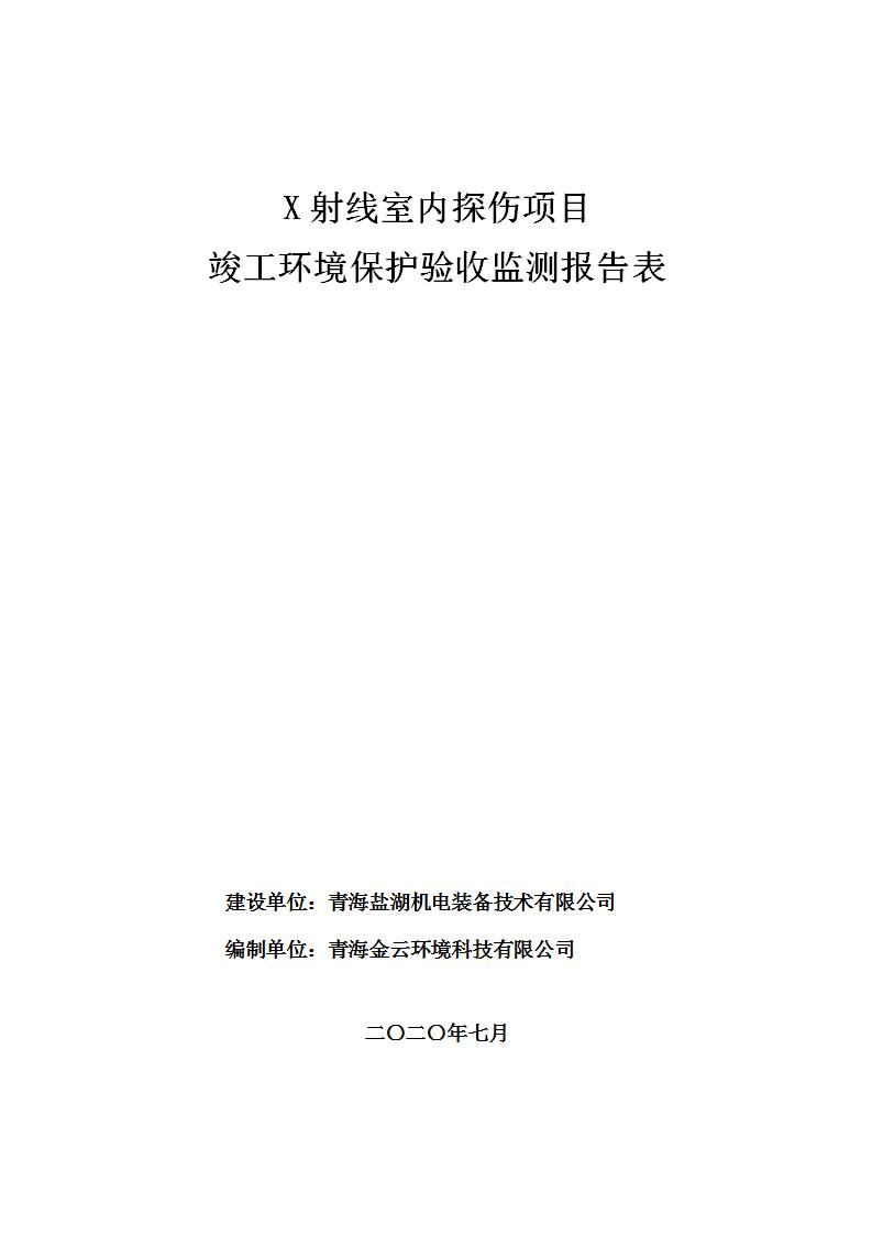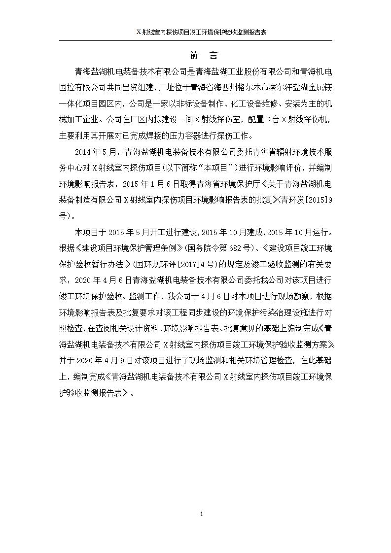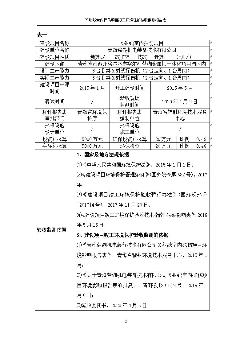 根據中華人民共和國國務院令第682號《國務院關于修改〈建設項目環(huán)境保護管理條例〉的決定》和《建設項目竣工環(huán)境保護驗收暫行辦法》(國務院令682號),青海鹽湖機電裝備技術有限公司X射線室內探傷項目竣工環(huán)境保護驗收監(jiān)測報告表公示如下。 一、項目名稱:X射線室內探傷項目竣工環(huán)境保護驗收監(jiān)測報告表 二、地點:青海省海西州格爾木市察爾汗鹽湖金屬鎂一體化項目園區(qū)內 三、建設單位:青海鹽湖機電裝備技術有限公司 四、建設內容:本項目位于公司三號車間廠房內,探傷室長21m,寬9.3m,共有3臺X射線探傷機。 五、聯(lián)系人:楊工 六、聯(lián)系電 話:0971-6515411 七、公示時間:二〇二〇年七月十日至二〇二〇年八月六日 公示期間,對上述公示內容如有異議,請以書面形式反饋,個人須署真實姓名,單位須加蓋公章。