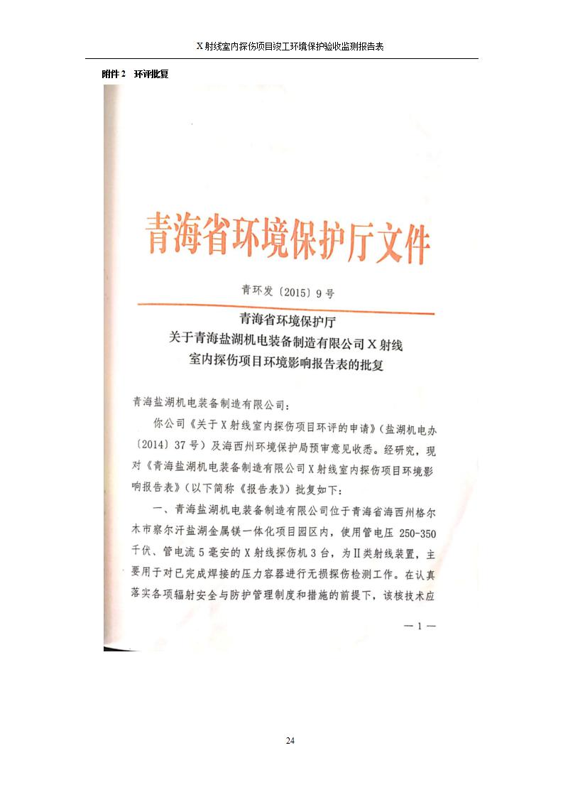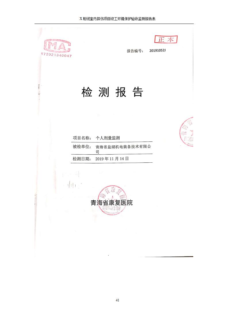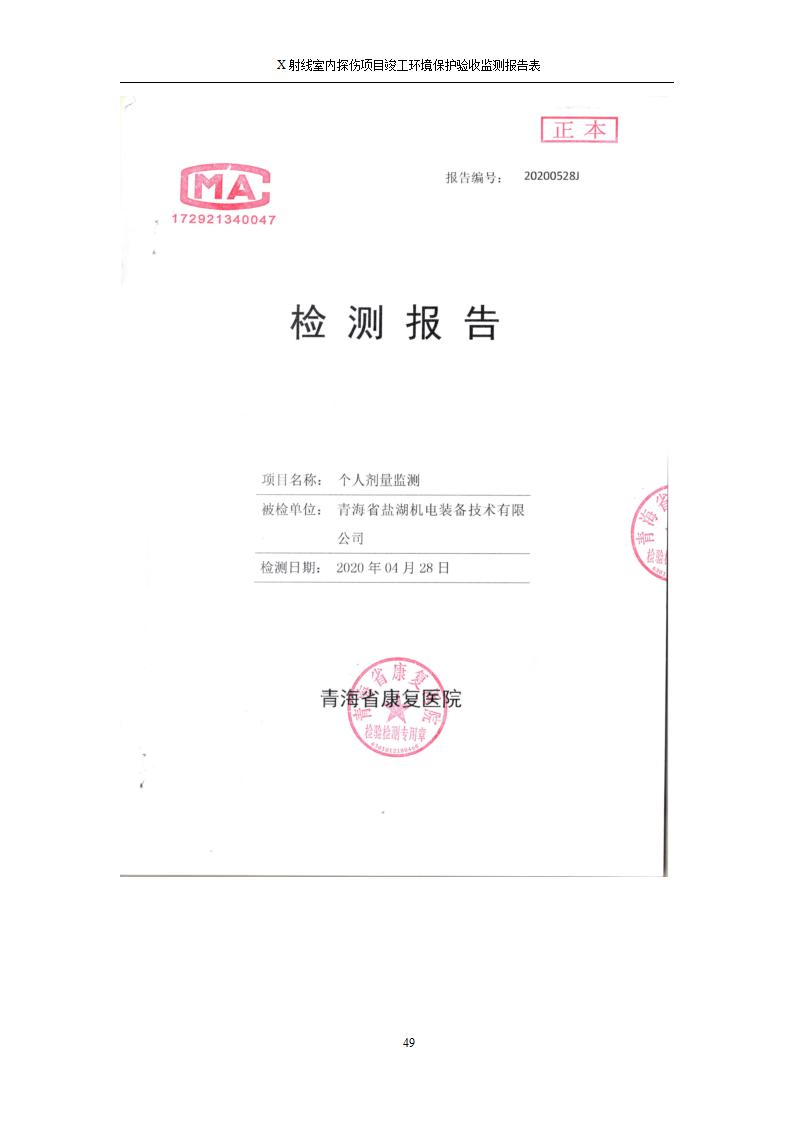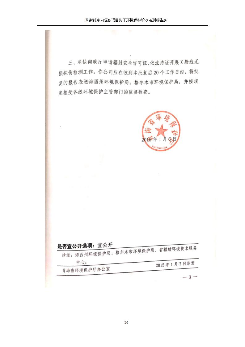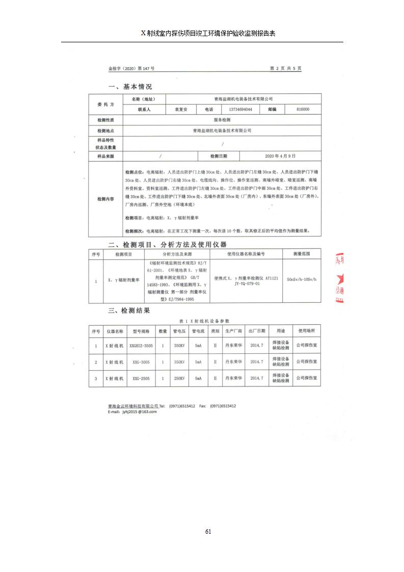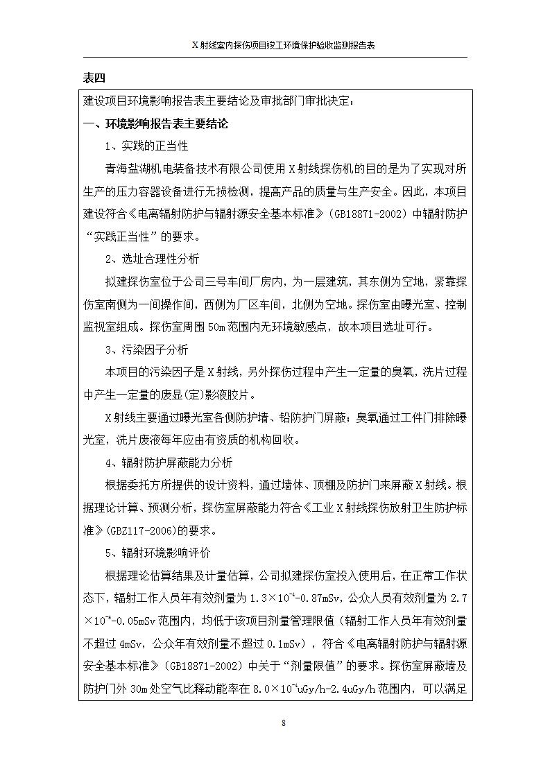根據中華人民共和國國務院令第682號《國務院關于修改〈建設項目環(huán)境保護管理條例〉的決定》和《建設項目竣工環(huán)境保護驗收暫行辦法》(國務院令682號),青海鹽湖機電裝備技術有限公司X射線室內探傷項目竣工環(huán)境保護驗收監(jiān)測報告表公示如下。 一、項目名稱:X射線室內探傷項目竣工環(huán)境保護驗收監(jiān)測報告表 二、地點:青海省海西州格爾木市察爾汗鹽湖金屬鎂一體化項目園區(qū)內 三、建設單位:青海鹽湖機電裝備技術有限公司 四、建設內容:本項目位于公司三號車間廠房內,探傷室長21m,寬9.3m,共有3臺X射線探傷機。 五、聯(lián)系人:楊工 六、聯(lián)系電 話:0971-6515411 七、公示時間:二〇二〇年七月十日至二〇二〇年八月六日 公示期間,對上述公示內容如有異議,請以書面形式反饋,個人須署真實姓名,單位須加蓋公章。