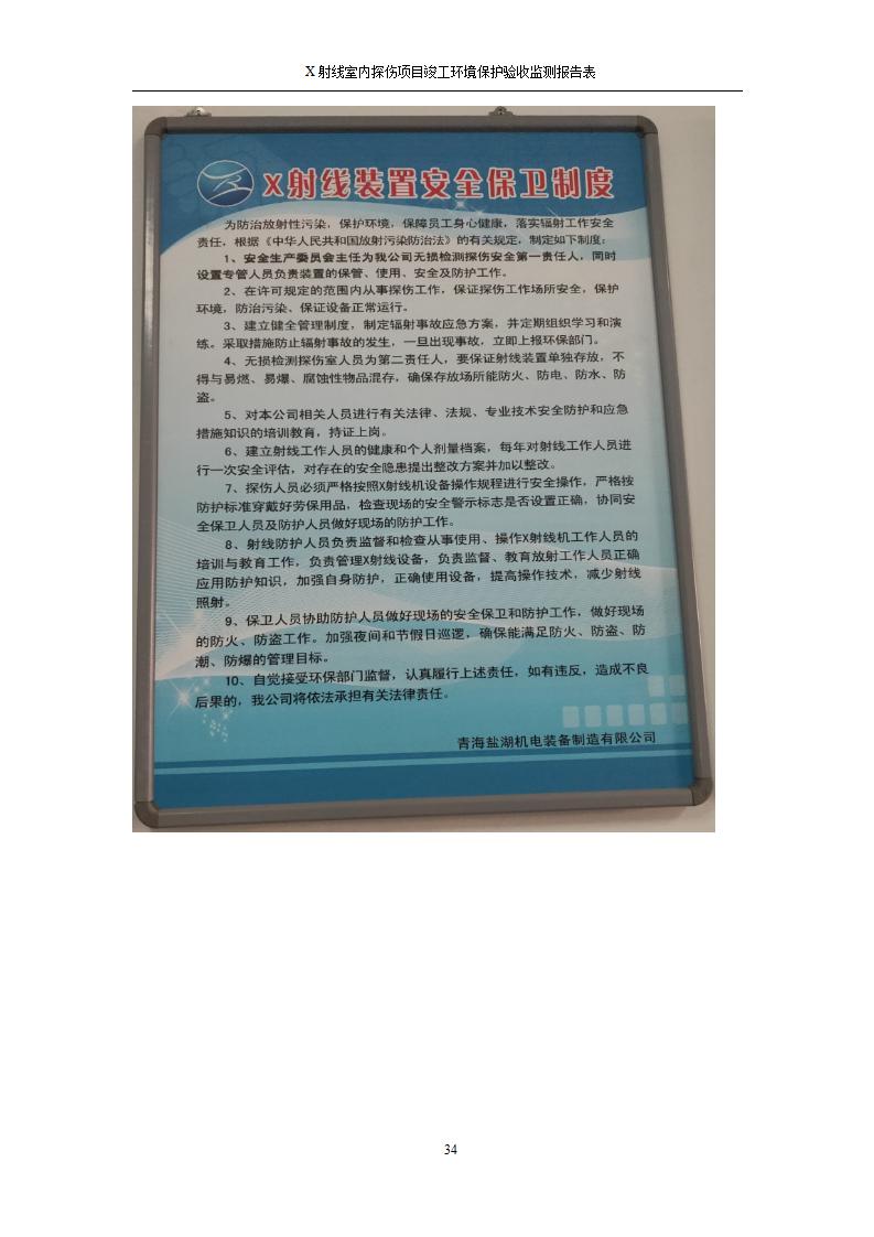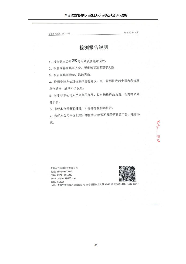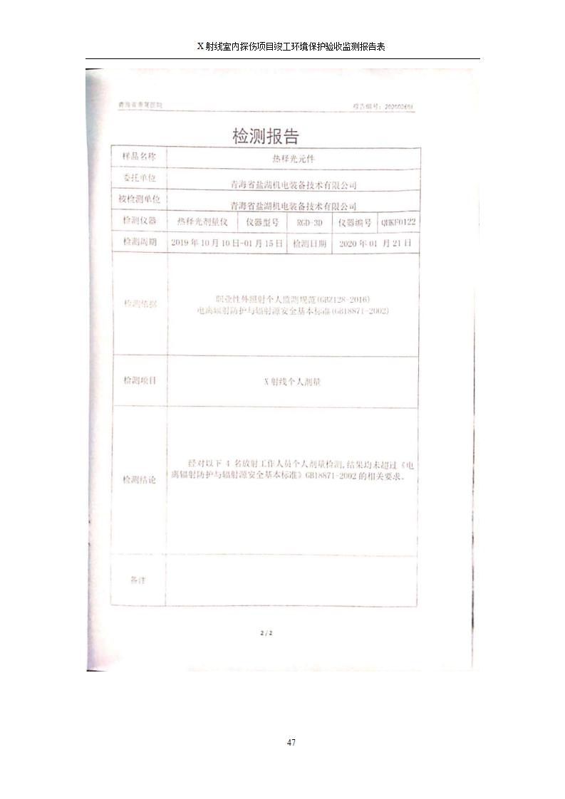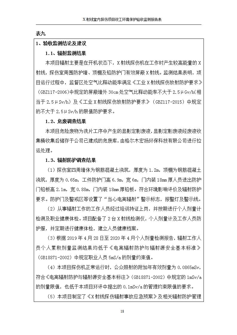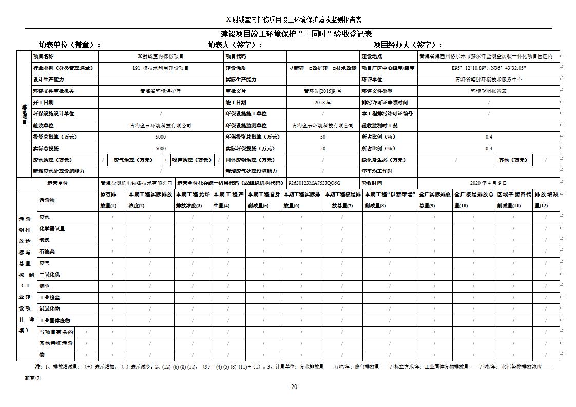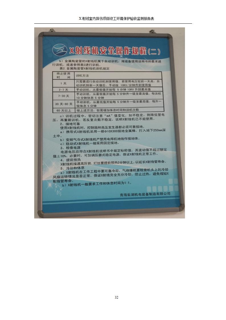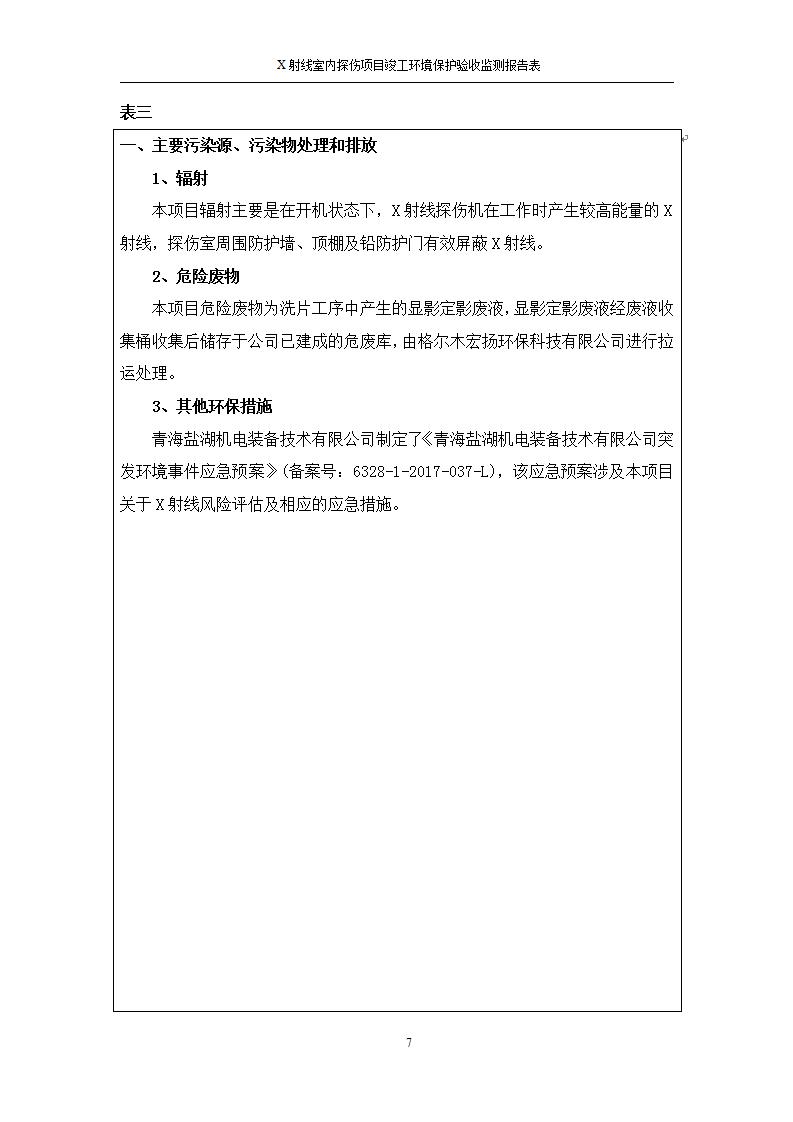 根據中華人民共和國國務院令第682號《國務院關于修改〈建設項目環(huán)境保護管理條例〉的決定》和《建設項目竣工環(huán)境保護驗收暫行辦法》(國務院令682號),青海鹽湖機電裝備技術有限公司X射線室內探傷項目竣工環(huán)境保護驗收監(jiān)測報告表公示如下。 一、項目名稱:X射線室內探傷項目竣工環(huán)境保護驗收監(jiān)測報告表 二、地點:青海省海西州格爾木市察爾汗鹽湖金屬鎂一體化項目園區(qū)內 三、建設單位:青海鹽湖機電裝備技術有限公司 四、建設內容:本項目位于公司三號車間廠房內,探傷室長21m,寬9.3m,共有3臺X射線探傷機。 五、聯(lián)系人:楊工 六、聯(lián)系電 話:0971-6515411 七、公示時間:二〇二〇年七月十日至二〇二〇年八月六日 公示期間,對上述公示內容如有異議,請以書面形式反饋,個人須署真實姓名,單位須加蓋公章。