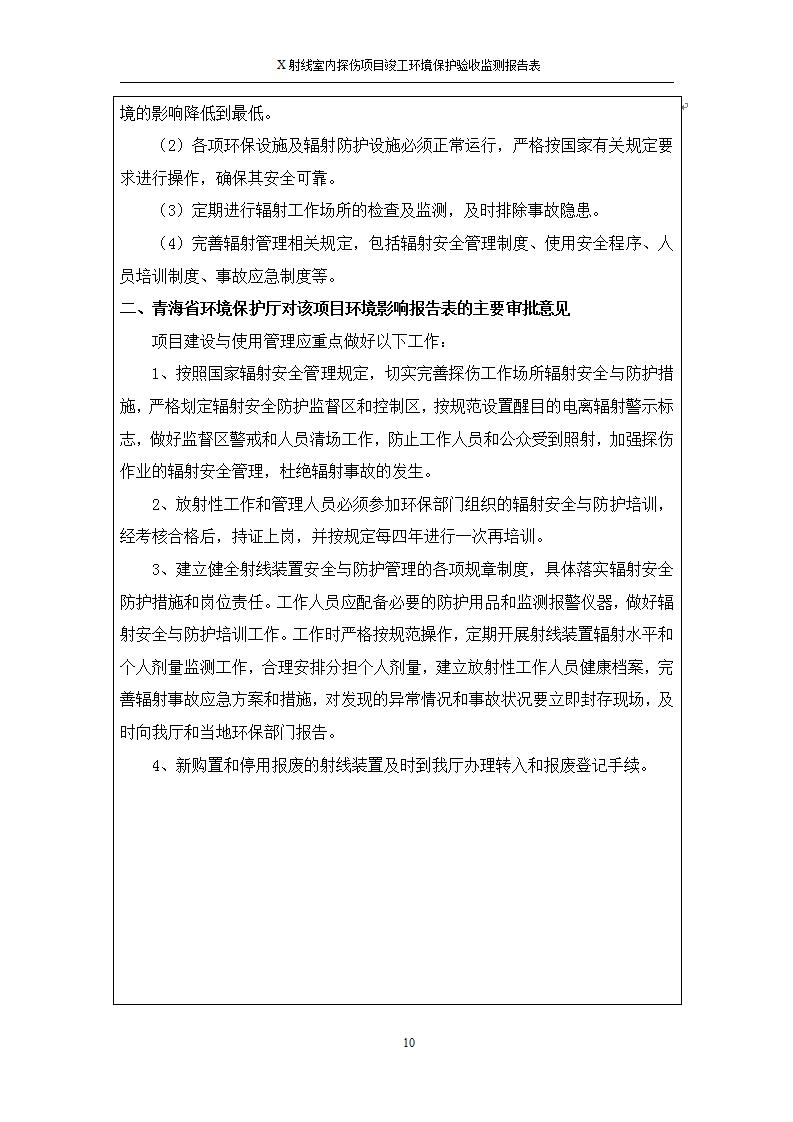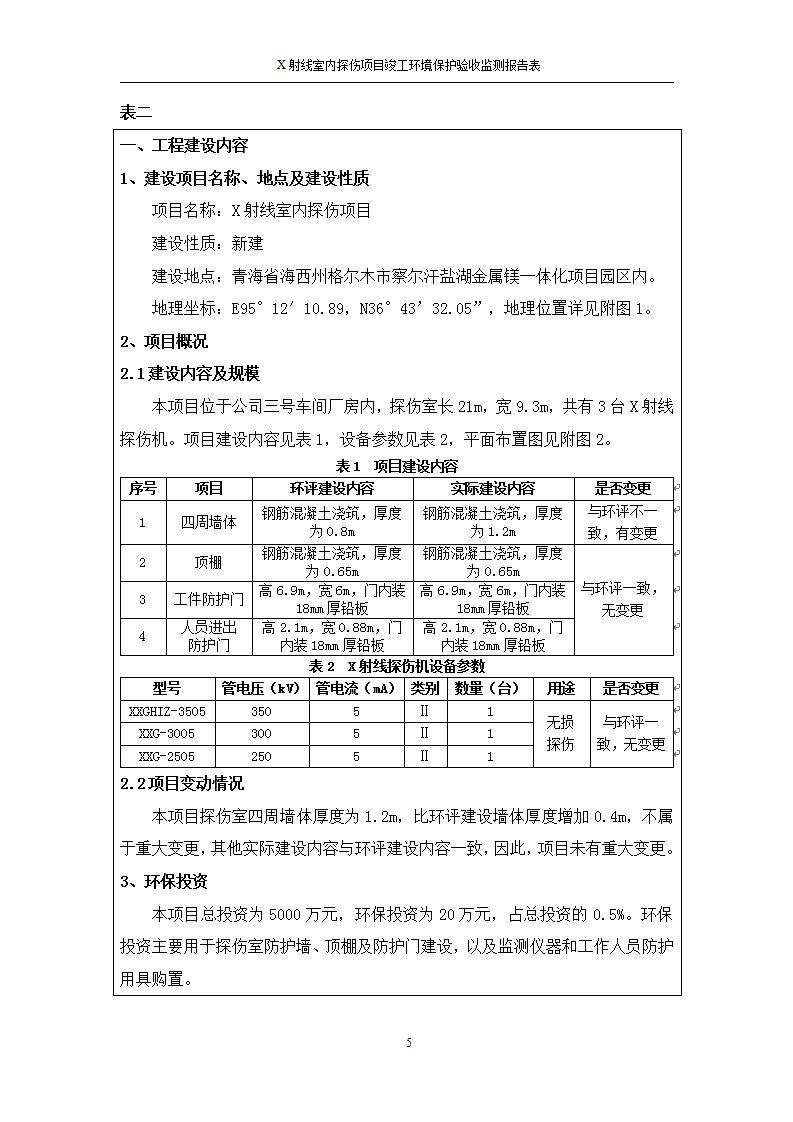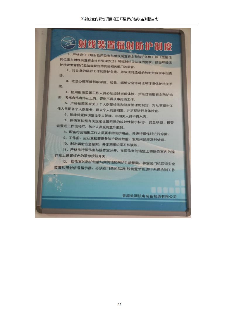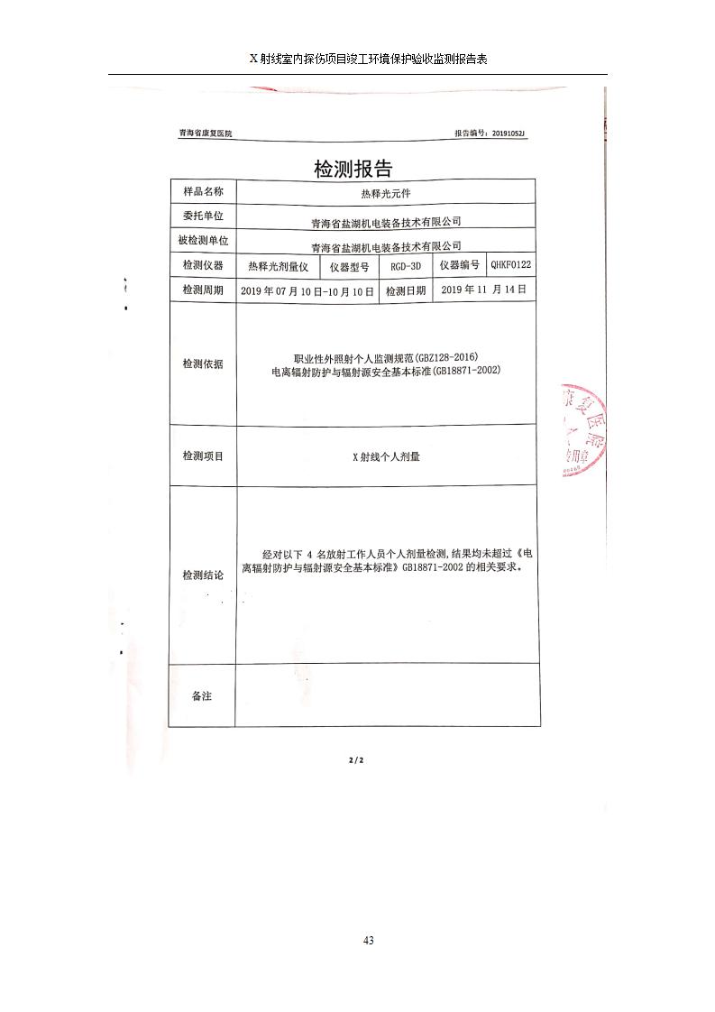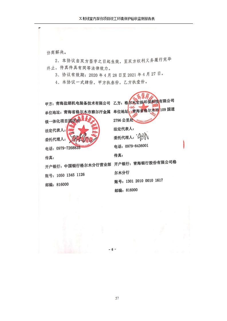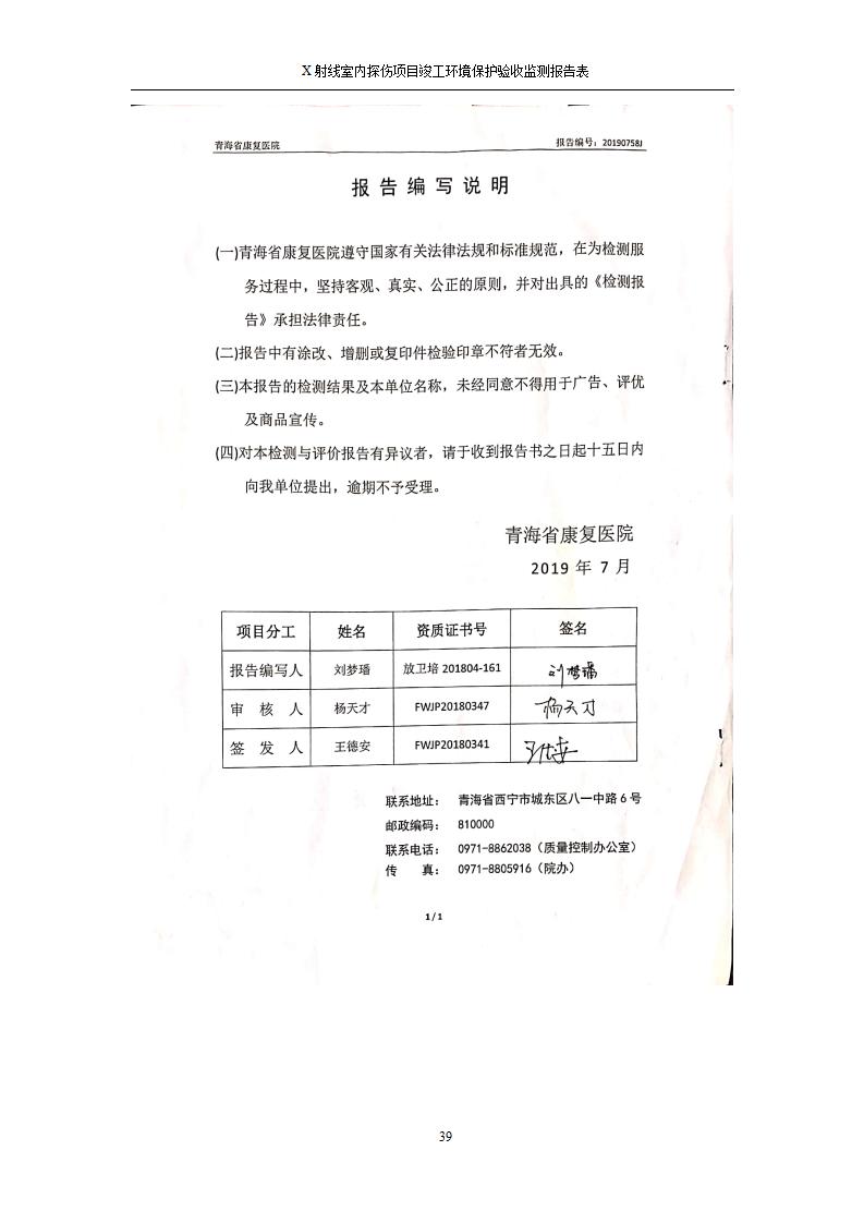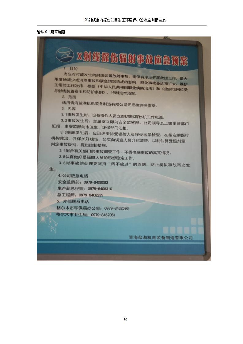 根據中華人民共和國國務院令第682號《國務院關于修改〈建設項目環(huán)境保護管理條例〉的決定》和《建設項目竣工環(huán)境保護驗收暫行辦法》(國務院令682號),青海鹽湖機電裝備技術有限公司X射線室內探傷項目竣工環(huán)境保護驗收監(jiān)測報告表公示如下。 一、項目名稱:X射線室內探傷項目竣工環(huán)境保護驗收監(jiān)測報告表 二、地點:青海省海西州格爾木市察爾汗鹽湖金屬鎂一體化項目園區(qū)內 三、建設單位:青海鹽湖機電裝備技術有限公司 四、建設內容:本項目位于公司三號車間廠房內,探傷室長21m,寬9.3m,共有3臺X射線探傷機。 五、聯(lián)系人:楊工 六、聯(lián)系電 話:0971-6515411 七、公示時間:二〇二〇年七月十日至二〇二〇年八月六日 公示期間,對上述公示內容如有異議,請以書面形式反饋,個人須署真實姓名,單位須加蓋公章。