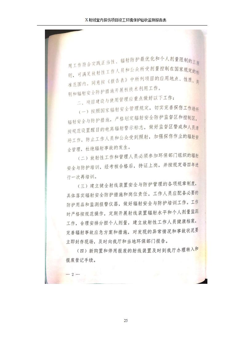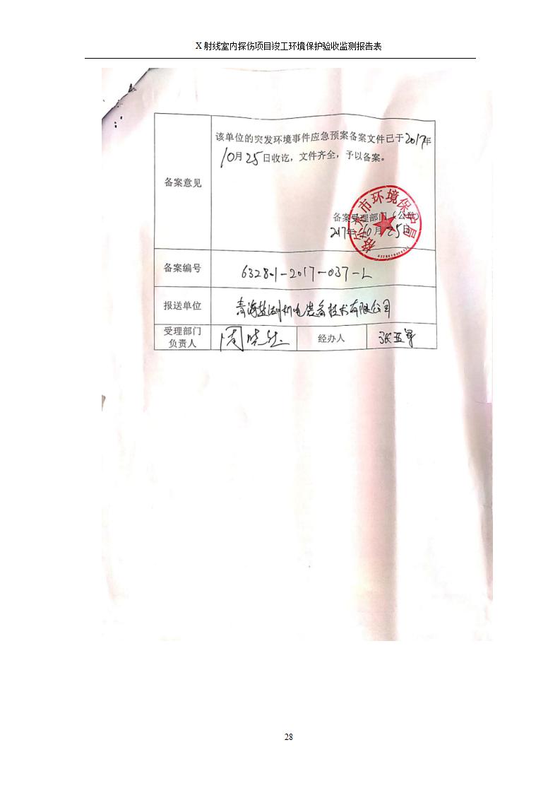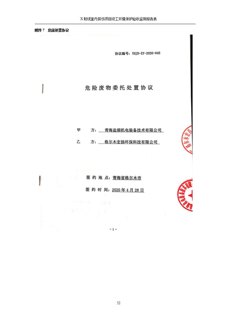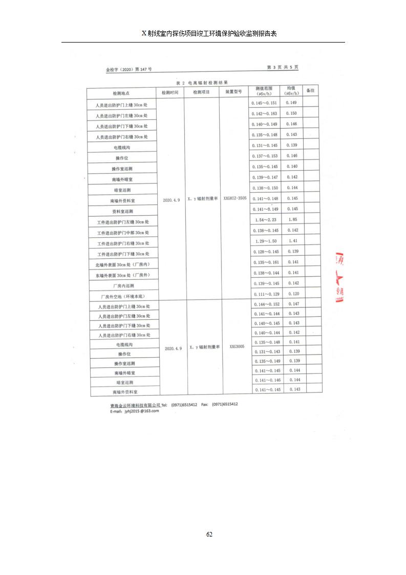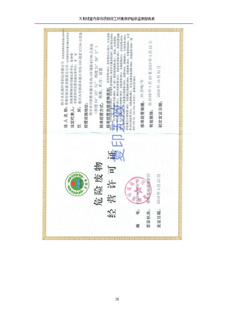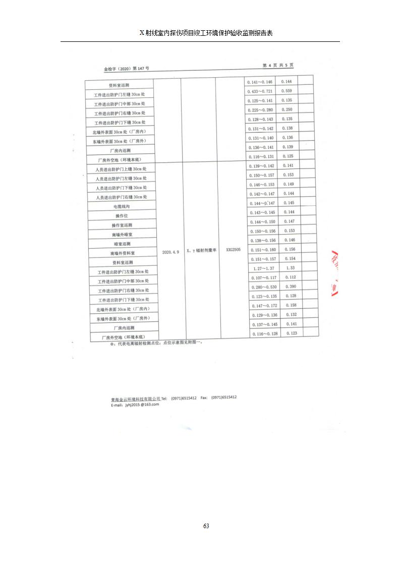 根據中華人民共和國國務院令第682號《國務院關于修改〈建設項目環(huán)境保護管理條例〉的決定》和《建設項目竣工環(huán)境保護驗收暫行辦法》(國務院令682號),青海鹽湖機電裝備技術有限公司X射線室內探傷項目竣工環(huán)境保護驗收監(jiān)測報告表公示如下。 一、項目名稱:X射線室內探傷項目竣工環(huán)境保護驗收監(jiān)測報告表 二、地點:青海省海西州格爾木市察爾汗鹽湖金屬鎂一體化項目園區(qū)內 三、建設單位:青海鹽湖機電裝備技術有限公司 四、建設內容:本項目位于公司三號車間廠房內,探傷室長21m,寬9.3m,共有3臺X射線探傷機。 五、聯(lián)系人:楊工 六、聯(lián)系電 話:0971-6515411 七、公示時間:二〇二〇年七月十日至二〇二〇年八月六日 公示期間,對上述公示內容如有異議,請以書面形式反饋,個人須署真實姓名,單位須加蓋公章。